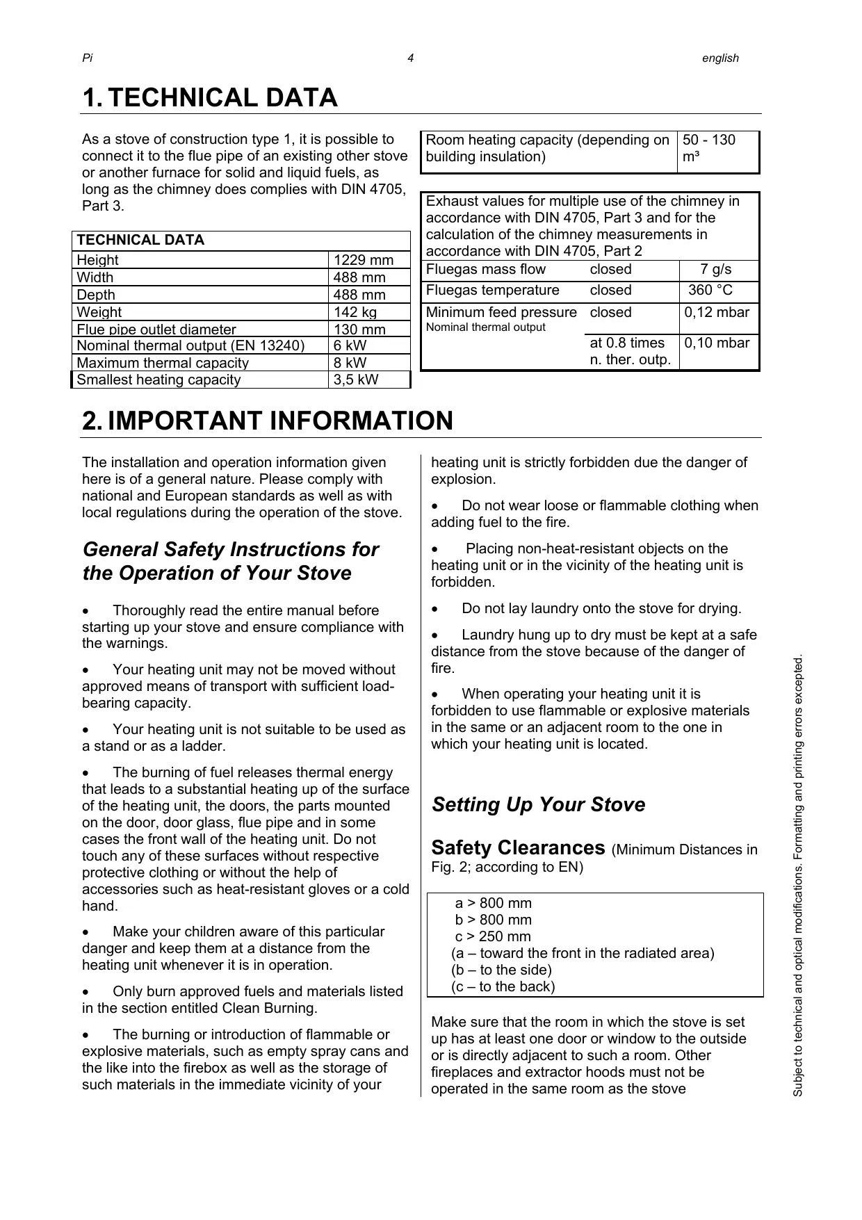 The installation and operation information given here is of a general nature. Please comply with national and European standards as well as with local regulations during the operation of the stove. heating unit is strictly forbidden due the danger of explosion. General Safety Instructions for the Operation of Your Stove