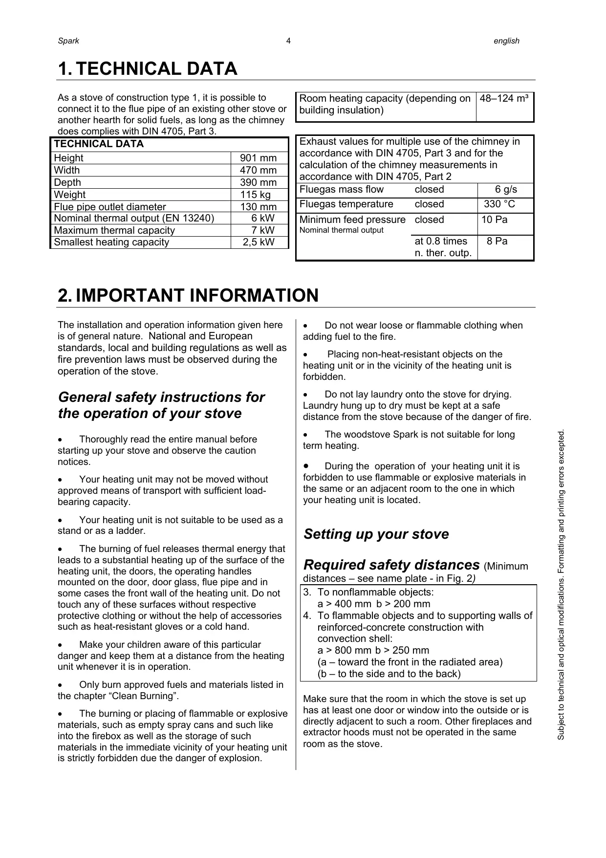 The installation and operation information given here is of general nature. National and European standards, local and building regulations as well as fire prevention laws must be observed during the operation of the stove.