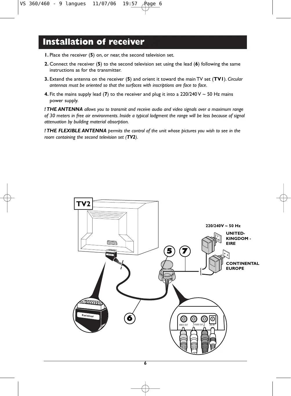 1. Place the receiver (5) on, or near, the second television set. 2. Connect the receiver (5) to the second television set using the lead (6) following the same instructions as for the transmitter. 3. Extend the antenna on the receiver (5) and orient it toward the main TV set (TV1). Circular antennas must be oriented so that the surfaces with inscriptions are face to face. 4. Fit the mains supply lead (7) to the receiver and plug it into a 220/240 V ~ 50 Hz mains power supply. ! THE ANTENNA allows you to transmit and receive audio and video signals over a maximum range of 30 meters in free air environments. Inside a typical lodgment the range will be less because of signal attenuation by building material absorption. ! THE FLEXIBLE ANTENNA permits the control of the unit whose pictures you wish to see in the room containing the second television set (TV2).
