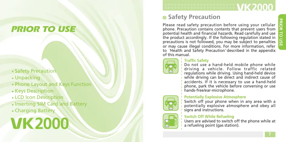 Hello, Thank you for purchasing VK cellular phone. Thank you again for choosing VK product and we hope you have greatest success in your business with VK2000. Please read Safety Precaution" prior to use. The content of this manual and functions of cellular phone are subject to change depending on the software version and conditions in business.