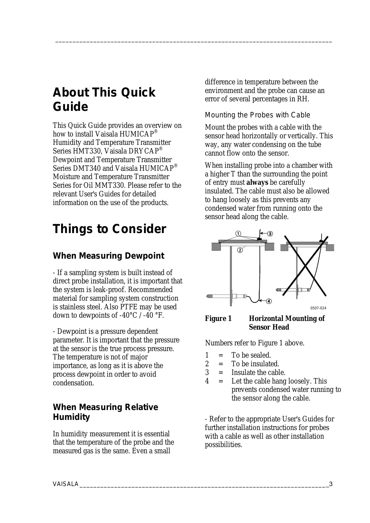 About This Quick Guide This Quick Guide provides an overview on how to install Vaisala HUMICAP® Humidity and Temperature Transmitter Series HMT330, Vaisala DRYCAP® Dewpoint and Temperature Transmitter Series DMT340 and Vaisala HUMICAP® Moisture and Temperature Transmitter Series for Oil MMT330. Please refer to the relevant User's Guides for detailed information on the use of the products. difference in temperature between the environment and the probe can cause an error of several percentages in RH. Mounting the Probes with Cable Mount the probes with a cable with the sensor head horizontally or vertically. This way, any water condensing on the tube cannot flow onto the sensor. When installing probe into a chamber with a higher T than the surrounding the point of entry must always be carefully insulated. The cable must also be allowed to hang loosely as this prevents any condensed water from running onto the sensor head along the cable. Things to Consider When Measuring Dewpoint - If a sampling system is built instead of direct probe installation, it is important that the system is leak-proof. Recommended material for sampling system construction is stainless steel. Also PTFE may be used down to dewpoints of -40°C / -40 °F. - Dewpoint is a pressure dependent parameter. It is important that the pressure at the sensor is the true process pressure. The temperature is not of major importance, as long as it is above the process dewpoint in order to avoid condensation. When Measuring Relative Humidity In humidity measurement it is essential that the temperature of the probe and the measured gas is the same. Even a small 0507-024 Figure 1 Horizontal Mounting of Sensor Head Numbers refer to Figure 1 above.
