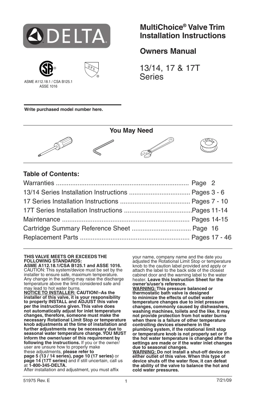 Warranties Page 2 13/14 Series Installation Instructions Pages 3 - 6 17 Series Installation Instructions Pages 7 - 10 17T Series Installation Instructions Pages 11-14 Maintenance Pages 14-15 Cartridge Summary Reference Sheet Page 16 Replacement Parts Pages 17 - 46 THIS VALVE MEETS OR EXCEEDS THE FOLLOWING STANDARDS: ASME A112.18.1/CSA B125.1 and ASSE 1016. CAUTION: This system/device must be set by the installer to ensure safe, maximum temperature. Any change in the setting may raise the discharge temperature above the limit considered safe and may lead to hot water burns. NOTICE TO INSTALLER: CAUTION!–As the installer of this valve, it is your responsibility to properly INSTALL and ADJUST this valve per the instructions given. This valve does not automatically adjust for inlet temperature changes, therefore, someone must make the necessary Rotational Limit Stop or temperature knob adjustments at the time of installation and further adjustments may be necessary due to seasonal water temperature change. YOU MUST inform the owner/user of this requirement by following the instructions. If you or the owner/ user are unsure how to properly make these adjustments, please refer to page 5 (13 / 14 series), page 10 (17 series) or page 14 (17T series) and if still uncertain, call us at 1-800-345-DELTA. After installation and adjustment, you must affix 51975 Rev. E