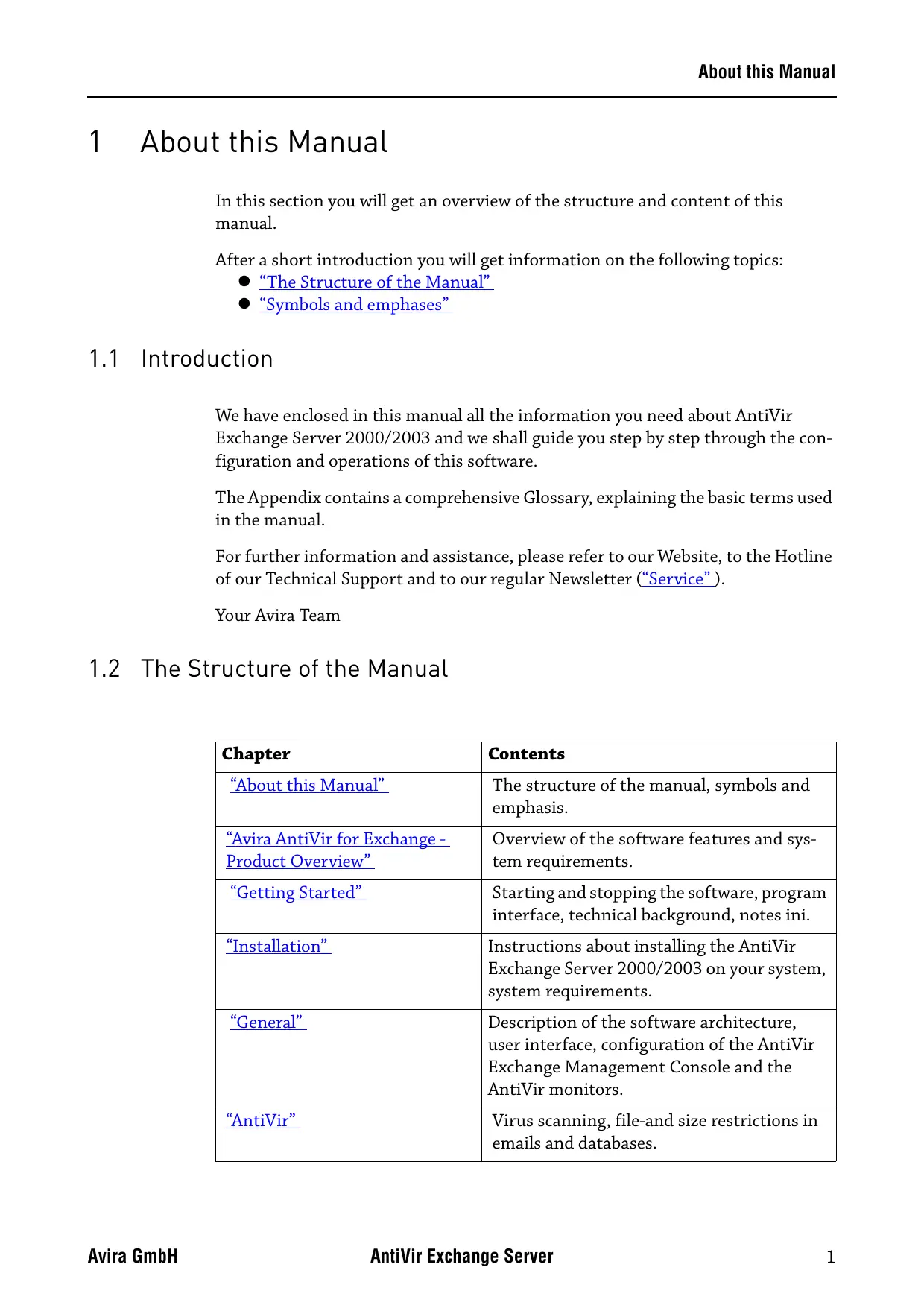Chapter Contents “About this Manual” The structure of the manual, symbols and emphasis. “Avira AntiVir for Exchange - Product Overview” Overview of the software features and sys- tem requirements. Getting Started” Starting and stopping the software, program interface, technical background, notes ini. “Installation” Instructions about installing the AntiVir Exchange Server 2000/2003 on your system, system requirements. “General” Description of the software architecture, user interface, configuration of the AntiVir Exchange Management Console and the AntiVir monitors. “AntiVir” Virus scanning, file-and size restrictions in emails and databases. Avira GmbH AntiVir Exchange Server