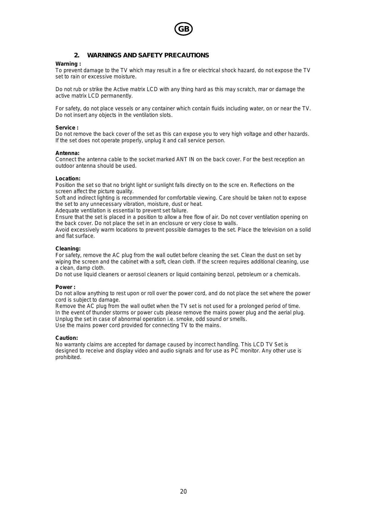 To prevent damage to the TV which may result in a fire or electrical shock hazard, do not expose the TV set to rain or excessive moisture. Do not rub or strike the Active matrix LCD with any thing hard as this may scratch, mar or damage the active matrix LCD permanently. For safety, do not place vessels or any container which contain fluids including water, on or near the TV. Do not insert any objects in the ventilation slots. Service : Do not remove the back cover of the set as this can expose you to very high voltage and other hazards. If the set does not operate properly, unplug it and call service person. Antenna: Connect the antenna cable to the socket marked ANT IN on the back cover. For the best reception an outdoor antenna should be used. Location: Position the set so that no bright light or sunlight falls directly on to the scre en. Reflections on the screen affect the picture quality. Soft and indirect lighting is recommended for comfortable viewing. Care should be taken not to expose the set to any unnecessary vibration, moisture, dust or heat. Adequate ventilation is essential to prevent set failure. Ensure that the set is placed in a position to allow a free flow of air. Do not cover ventilation opening on the back cover. Do not place the set in an enclosure or very close to walls. Avoid excessively warm locations to prevent possible damages to the set. Place the television on a solid and flat surface. Cleaning: For safety, remove the AC plug from the wall outlet before cleaning the set. Clean the dust on set by wiping the screen and the cabinet with a soft, clean cloth. If the screen requires additional cleaning, use a clean, damp cloth. Do not use liquid cleaners or aerosol cleaners or liquid containing benzol, petroleum or a chemicals. Power : Do not allow anything to rest upon or roll over the power cord, and do not place the set where the power cord is subject to damage. Remove the AC plug from the wall outlet when the TV set is not used for a prolonged period of time. In the event of thunder storms or power cuts please remove the mains power plug and the aerial plug. Unplug the set in case of abnormal operation i.e. smoke, odd sound or smells. Use the mains power cord provided for connecting TV to the mains. Caution: No warranty claims are accepted for damage caused by incorrect handling. This LCD TV Set is designed to receive and display video and audio signals and for use as PC monitor. Any other use is prohibited.