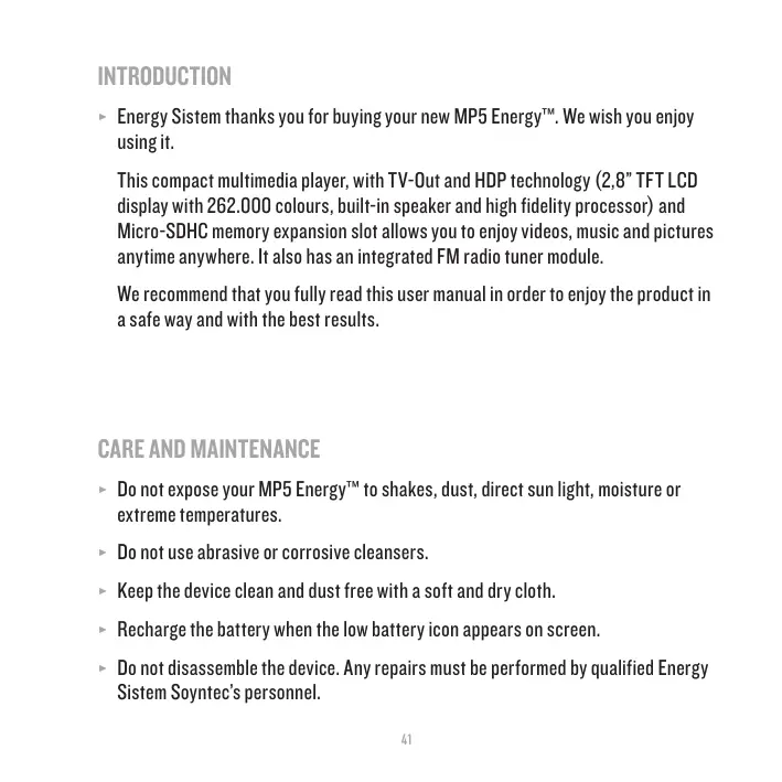 ≥≥ Do not expose your MP5 Energy™ to shakes, dust, direct sun light, moisture or extreme temperatures. ≥≥ Do not use abrasive or corrosive cleansers. ≥≥ Keep the device clean and dust free with a soft and dry cloth. ≥≥ Recharge the battery when the low battery icon appears on screen. ≥≥ Do not disassemble the device. Any repairs must be performed by qualified Energy Sistem Soyntec’s personnel.