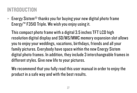 Energy System® thanks you for buying your new digital photo frame Energy™ F3510 Triple. We wish you enjoy using it.