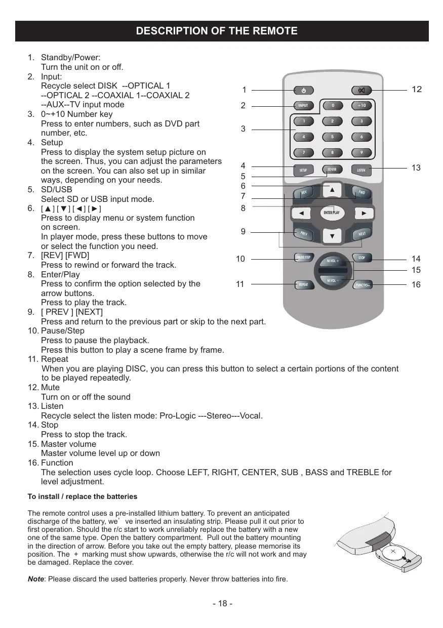 The selection uses cycle loop. Choose LEFT, RIGHT, CENTER, SUB , BASS and TREBLE for level adjustment. To install / replace the batteries The remote control uses a pre-installed lithium battery. To prevent an anticipated discharge of the battery, we' ve inserted an insulating strip. Please pull it out prior to first operation. Should the r/c start to work unreliably replace the battery with a new one of the same type. Open the battery compartment. Pull out the battery mounting in the direction of arrow. Before you take out the empty battery, please memorise its position. The + marking must show upwards, otherwise the r/c will not work and may be damaged. Replace the cover. Note: Please discard the used batteries properly. Never throw batteries into fire.