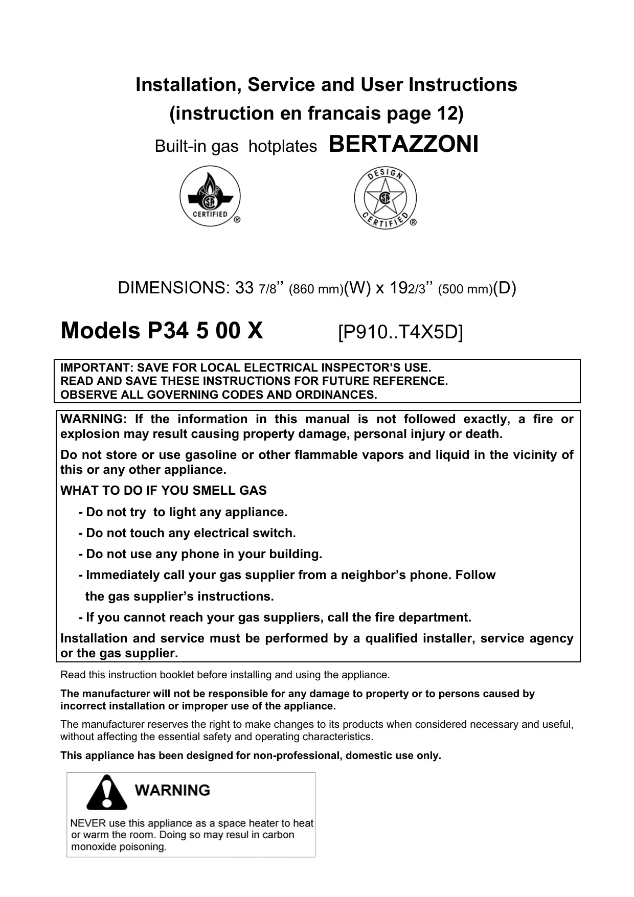 P34 5 00 X - Gas cooktop BERTAZZONI - Free user manual and instructions