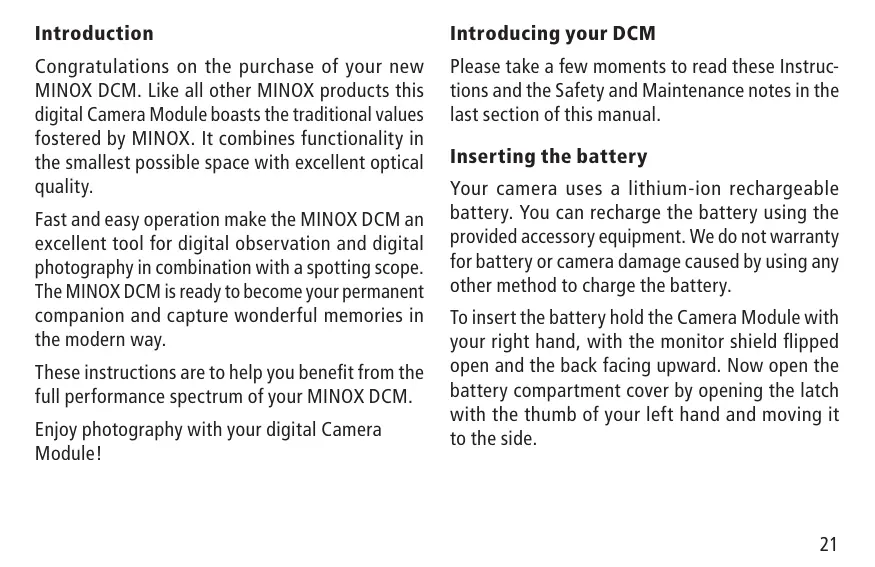 Congratulations on the purchase of your new MINOX DCM. Like all other MINOX products this digital Camera Module boasts the traditional values fostered by MINOX. It combines functionality in the smallest possible space with excellent optical quality.