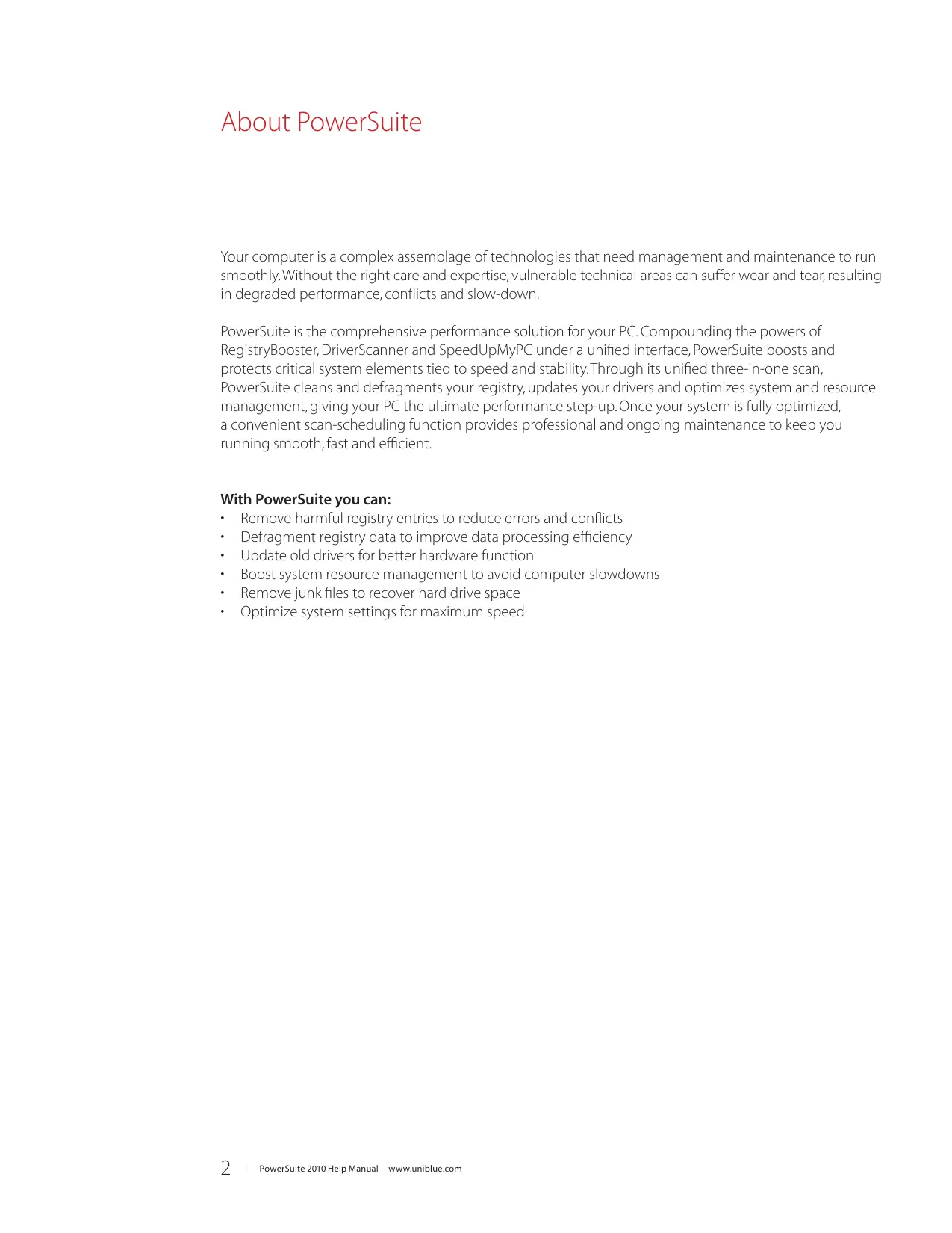Download the instructions for your System Optimization Software in PDF format for free! Find your manual POWERSUITE 2010 - UNIBLUE and take your electronic device back in hand. On this page are published all the documents necessary for the use of your device. POWERSUITE 2010 by UNIBLUE.