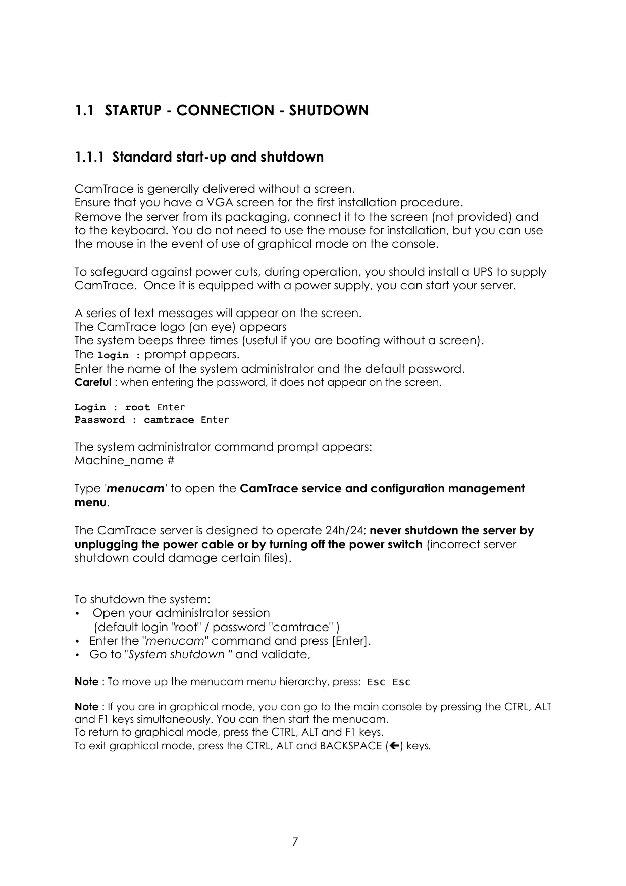 CamlTrace is generally delivered without a screen. Ensure that you have a VGA screen for the first installation procedure. Remove the server from its packaging, connect it to the screen (not provided) and to the keyboard. You do not need to use the mouse for installation, but you can use the mouse in the event of use of graphical mode on the console. To safeguard against power cuts, during operation, you should install a UPS to supply Camlrace. Once it is equipped with a power supply, you can start your server. A series of text messages will appear on the screen. The Camïrace logo (an eye) appears The system beeps three times (useful if you are booting without a screen). The login : prompt appears. Enter the name of the system administrator and the default password. Careful : when entering the password, it does not appear on the screen. Login : root Enter Password : camtrace Enter The system administrator command prompt appears: Machine_name # Type 'menucam' to open the Camlirace service and configuration management menu. The CamTrace server is designed to operate 24h/24; never shutdown the server by unplugging the power cable or by turning off the power switch [incorrect server shutdown could damage certain files). To shutdown the system: + __ Open your administrator session (default login root" / password "camtrace"]) + Enter the "menucam" command and press [Enter]. + Go to "System shutdown "and validate, Note : To move up the menucam menu hierarchy, press: Esc Esc Note : If you are in graphical mode, you can go to the main console by pressing the CTRL, ALT and F1 keys simultaneously. You can then start the menucam. To return to graphical mode, press the CTRL, ALT and F1 keys. To exit graphical mode, press the CTRL, ALT and BACKSPACE (€) keys.