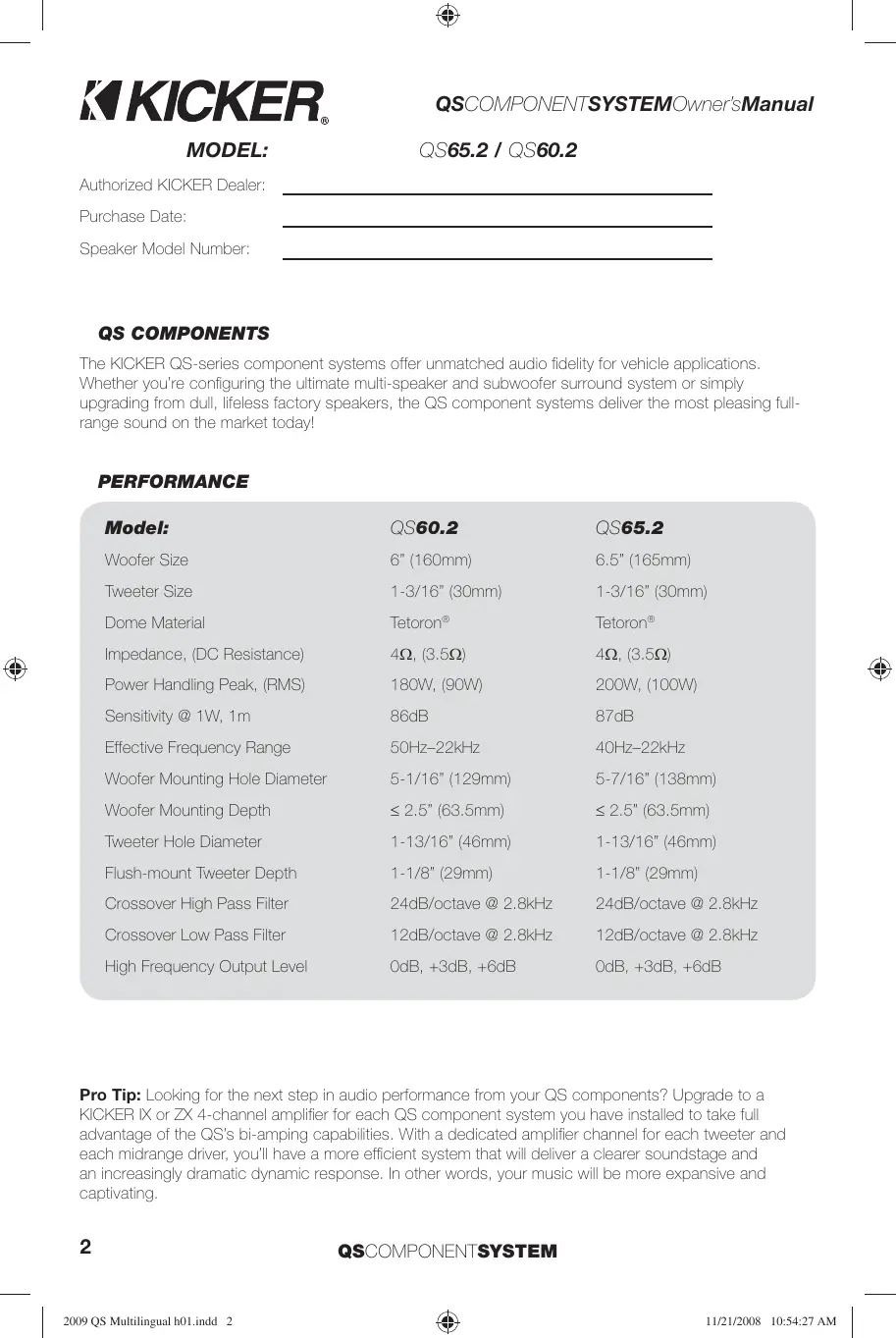 The KICKER QS-series component systems offer unmatched audio fidelity for vehicle applications. Whether you're configuring the ultimate multi-speaker and subwoofer surround system or simply upgrading from dull, lifeless factory speakers, the QS component systems deliver the most pleasing full-range sound on the market today!