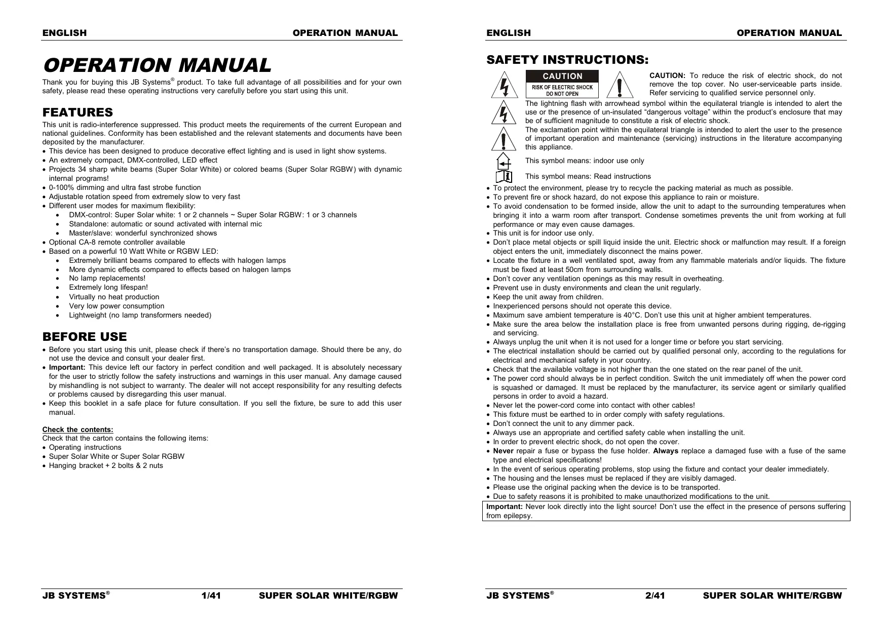 Thank you for buying this JB Systems® product. To take full advantage of all possibilities and for your own safety, please read these operating instructions very carefully before you start using this unit.