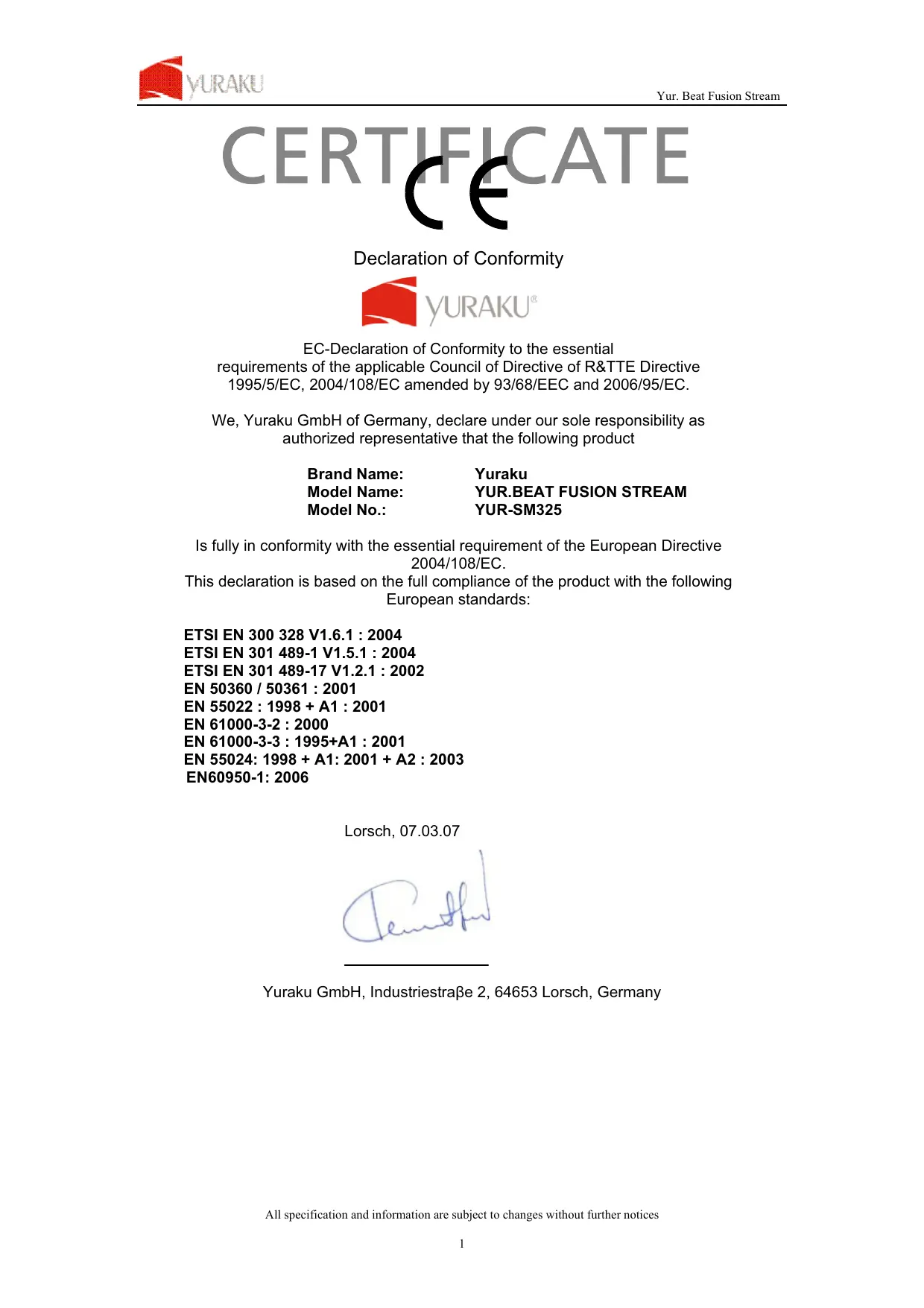1995/5/EC, 2004/108/EC amended by 93/68/EEC and 2006/95/EC. We, Yuraku GmbH of Germany, declare under our sole responsibility as authorized representative that the following product Brand Name: Model Name: Model No.: