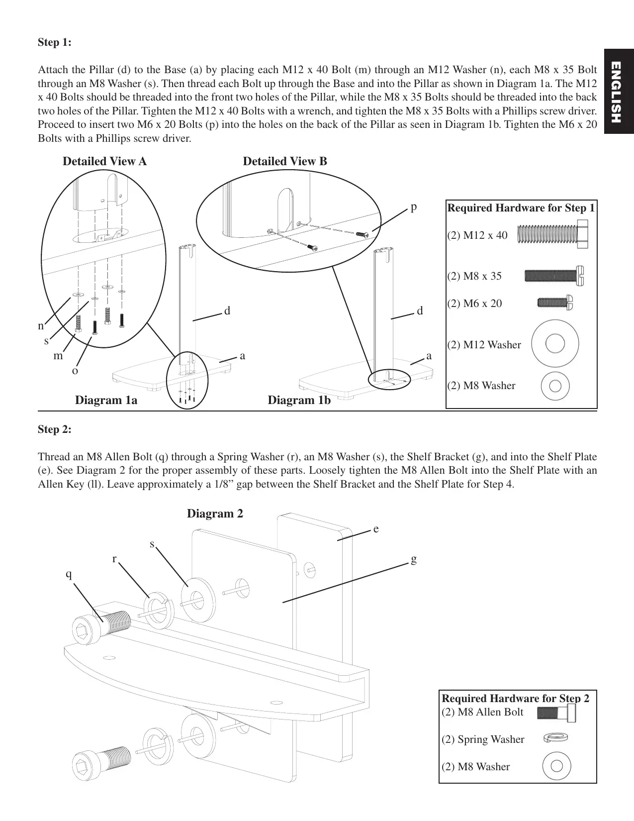 Required Hardware for Step 2 (2) M8 Allen Bolt (2) Spring Washer (2) M8 Washer ENGLISH Attach the Pillar (d) to the Base (a) by placing each M12 x 40 Bolt (m) through an M12 Washer (n), each M8 x 35 Bolt through an M8 Washer (s). Then thread each Bolt up through the Base and into the Pillar as shown in Diagram 1a. The M12 x 40 Bolts should be threaded into the front two holes of the Pillar, while the M8 x 35 Bolts should be threaded into the back two holes of the Pillar. Tighten the M12 x 40 Bolts with a wrench, and tighten the M8 x 35 Bolts with a Phillips screw driver. Proceed to insert two M6 x 20 Bolts (p) into the holes on the back of the Pillar as seen in Diagram 1b. Tighten the M6 x 20 Bolts with a Phillips screw driver. ENGLISH Step 3: Thread an M8 Allen Bolt (q) through a Spring Washer (r), an M8 Washer (s), through the middle hole in the Wall Bracket (c), and into the Wall Plate (f) as seen in Diagram 3. Loosely tighten the M8 Allen Bolt into the Wall Plate with an Allen Key (ll). Leave approximately a 1/8” gap between the Wall Bracket and the Wall Plate for Step 5.