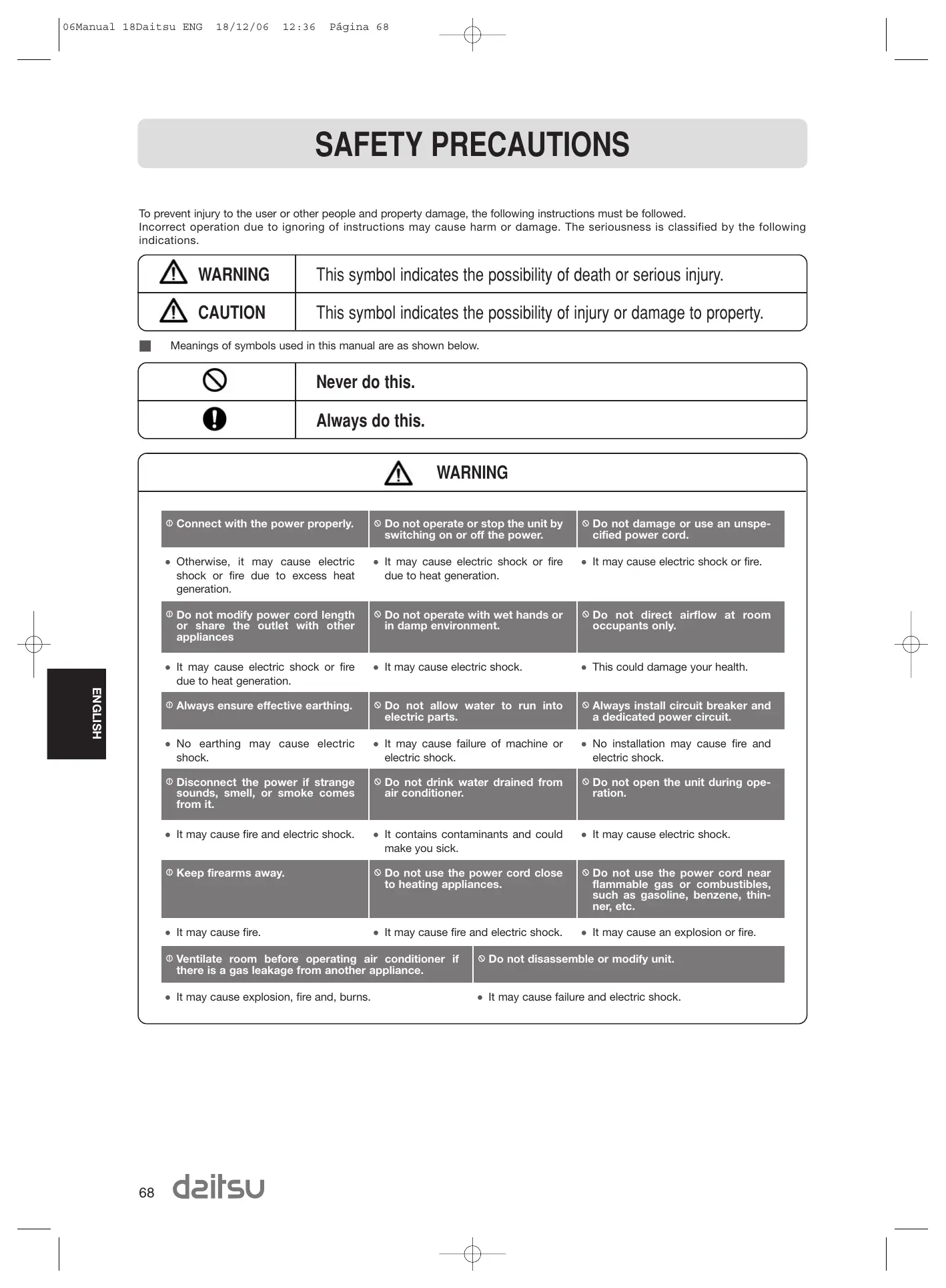 06Manual 18Daitsu ENG 18/12/06 12:36 Pâgina 68 é HSTION3 SAFETY PRECAUTIONS To prevent injury to the user or other people and property damage, the following instructions must be followed. Incorrect operation due to ignoring of instructions may cause harm or damage. The seriousness is classified by the following indications. VAN WARNING This symbol indicates the possibility of death or serious injury. VAN CAUTION This symbol indicates the possibility of injury or damage to property. M Meanings of symbols used in this manual are as shown below. O Never do this. O0 Always do this. A WARNING © Connect with the power properly. | © Do not operate or stop the unitby | © Do not damage or use an unspe- switching on or off the power. cified power cord. + Otherwise, it may cause electric + It may cause electric shock or fire + It may cause electric shock or fire. shock or fire due to excess heat due to heat generation. generation. © Do not modify power cord length | © Do not operate with wet hands or |©Do not direct airflow at room or share the outlet with other | in damp environment. occupants only. appliances + It may cause electric shock or fire + It may cause electric shock. + This could damage your health. due to heat generation. © Always ensure effective earthing. [© Do not allow water to run into |© Always install circuit breaker and electric parts. a dedicated power circuit. + No earthing may cause electric + It may cause failure of machine or + No installation may cause fire and shock. electric shock. electric shock. © Disconnect the power if strange |© Do not drink water drained from | © Do not open the unit during ope- sounds, smell, or smoke comes air conditioner. ration. from it. + It may cause fire and electric shock. + It contains contaminants and could + It may cause electric shock. make you sick. © Keep firearms away. © Do not use the power cord close |© Do not use the power cord near to heating appliances. flammable gas or combustibles, such as gasoline, benzene, thin- ner, etc. + It may cause fire. + It may cause fire and electric shock. + It may cause an explosion or fire. te room before operating © Do not disassemble or modify ui there is a gas leakage from another appliance. + lt may cause explosion, fire and, burns. + It may cause failure and electric shock. # deifsU