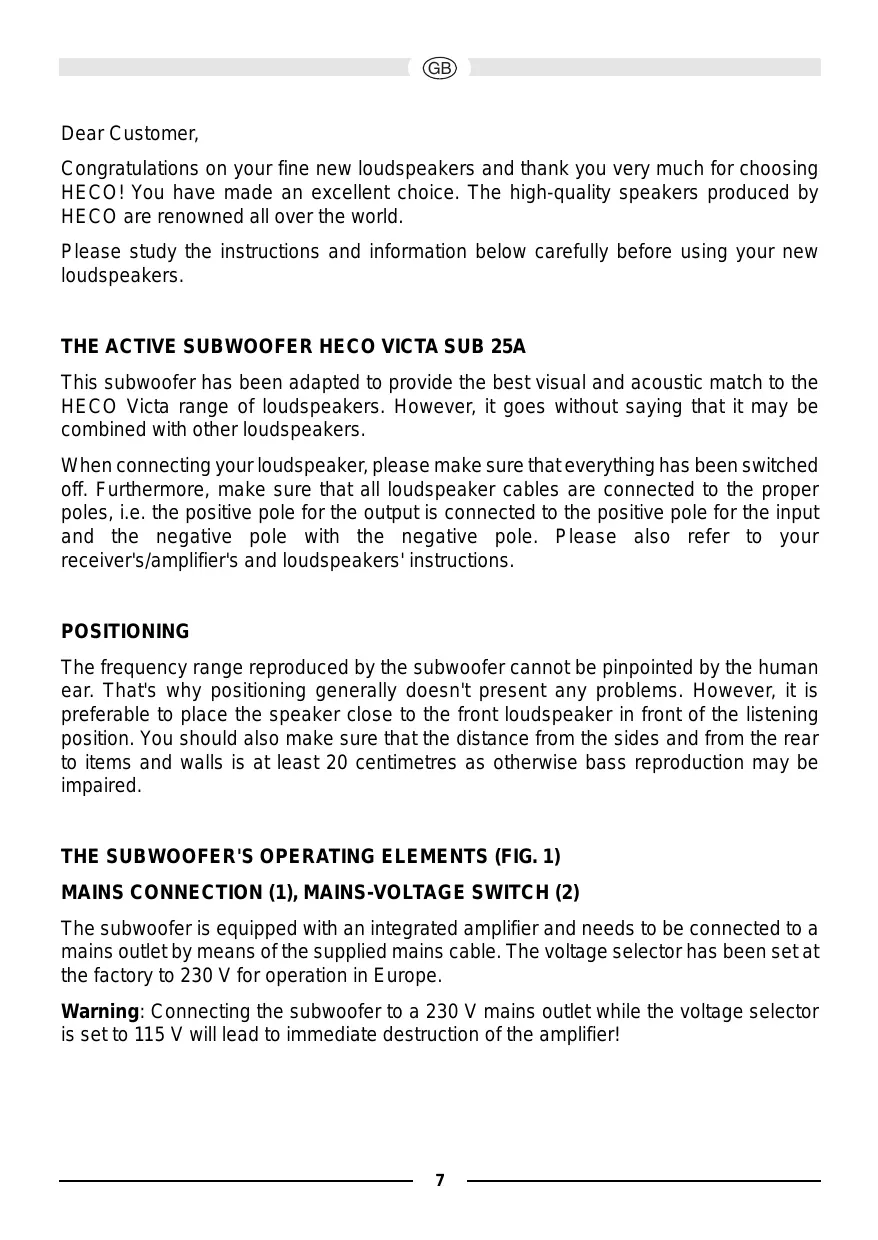 Warning: Connecting the subwoofer to a 230 V mains outlet while the voltage selector is set to 115 V will lead to immediate destruction of the amplifier!