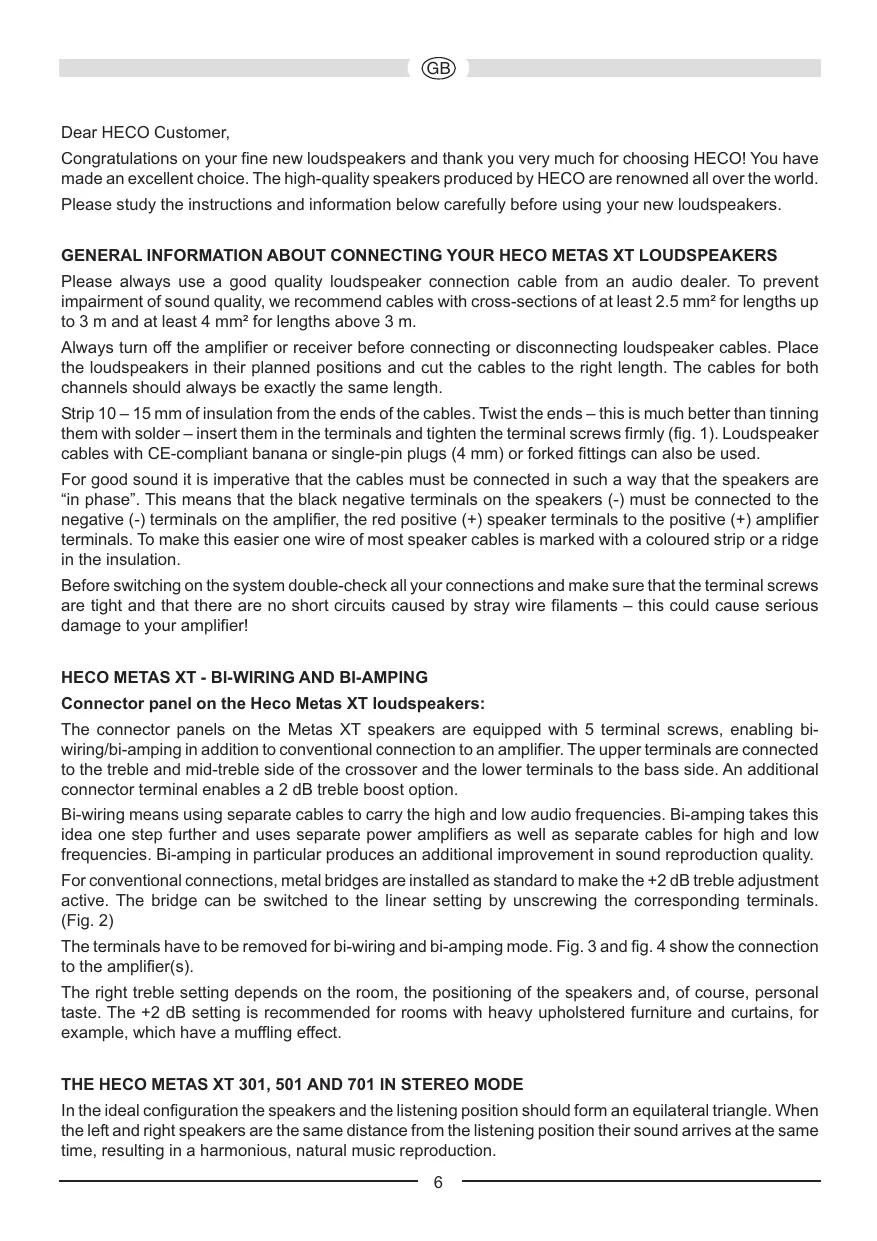 Dear HECO Customer, Congratulations on your fine new loudspeakers and thank you very much for choosing HECO! You have made an excellent choice. The high-quality speakers produced by HECO are renowned all over the world. Please study the instructions and information below carefully before using your new loudspeakers. GENERAL INFORMATION ABOUT CONNECTING YOUR HECO METAS XT LOUDSPEAKERS Please always use a good quality loudspeaker connection cable from an audio dealer. To prevent impairment of sound quality, we recommend cables with cross-sections of at least 2.5 mm² for lengths up to 3 m and at least 4 mm² for lengths above 3 m. Always turn off the amplifier or receiver before connecting or disconnecting loudspeaker cables. Place the loudspeakers in their planned positions and cut the cables to the right length. The cables for both channels should always be exactly the same length. Strip 10 – 15 mm of insulation from the ends of the cables. Twist the ends – this is much better than tinning them with solder – insert them in the terminals and tighten the terminal screws firmly (fig. 1). Loudspeaker cables with CE-compliant banana or single-pin plugs (4 mm) or forked fittings can also be used. For good sound it is imperative that the cables must be connected in such a way that the speakers are “in phase”. This means that the black negative terminals on the speakers (-) must be connected to the negative (-) terminals on the amplifier, the red positive (+) speaker terminals to the positive (+) amplifier terminals. To make this easier one wire of most speaker cables is marked with a coloured strip or a ridge in the insulation. Before switching on the system double-check all your connections and make sure that the terminal screws are tight and that there are no short circuits caused by stray wire filaments – this could cause serious damage to your amplifier! HECO METAS XT - BI-WIRING AND BI-AMPING Connector panel on the Heco Metas XT loudspeakers: The connector panels on the Metas XT speakers are equipped with 5 terminal screws, enabling biwiring/bi-amping in addition to conventional connection to an amplifier. The upper terminals are connected to the treble and mid-treble side of the crossover and the lower terminals to the bass side. An additional connector terminal enables a 2 dB treble boost option. Bi-wiring means using separate cables to carry the high and low audio frequencies. Bi-amping takes this idea one step further and uses separate power amplifiers as well as separate cables for high and low frequencies. Bi-amping in particular produces an additional improvement in sound reproduction quality. For conventional connections, metal bridges are installed as standard to make the +2 dB treble adjustment active. The bridge can be switched to the linear setting by unscrewing the corresponding terminals. (Fig. 2) The terminals have to be removed for bi-wiring and bi-amping mode. Fig. 3 and fig. 4 show the connection to the amplifier(s). The right treble setting depends on the room, the positioning of the speakers and, of course, personal taste. The +2 dB setting is recommended for rooms with heavy upholstered furniture and curtains, for example, which have a muffling effect. THE HECO METAS XT 301, 501 AND 701 IN STEREO MODE In the ideal configuration the speakers and the listening position should form an equilateral triangle. When the left and right speakers are the same distance from the listening position their sound arrives at the same time, resulting in a harmonious, natural music reproduction.