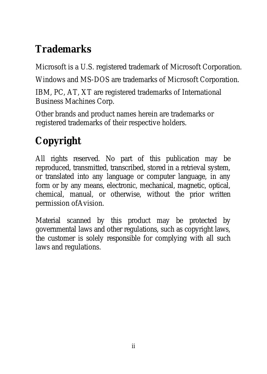 Trademarks Microsoft is a U.S. registered trademark of Microsoft Corporation. Windows and MS-DOS are trademarks of Microsoft Corporation. IBM, PC, AT, XT are registered trademarks of International Business Machines Corp. Other brands and product names herein are trademarks or registered trademarks of their respective holders. Copyright Al rights reserved. No part of this publication may be reproduced, transmitted, transcribed, stored in a retrieval system, or translated into any language or computer language, in any form or by any means, electronic, mechanical, magnetic, optical, chemical, manual, or otherwise, without the prior written permission ofA vision. Material scanned by this product may be protected by govemmental laws and other regulations, such as copyright laws, the customer is solely responsible for complying with all such laws and regulations.