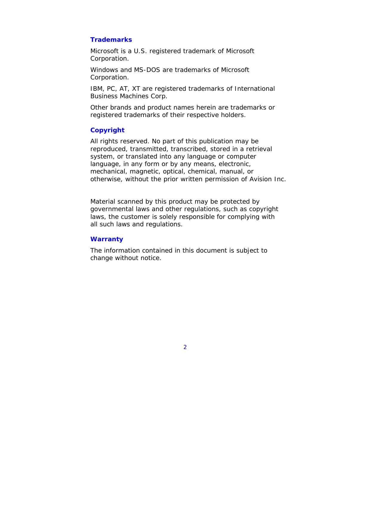 Trademarks Microsoft is a U.S. registered trademark of Microsoft Corporation. Windows and MS-DOS are trademarks of Microsoft Corporation. IBM, PC, AT, XT are registered trademarks of International Business Machines Corp. Other brands and product names herein are trademarks or registered trademarks of their respective holders. Copyright All rights reserved. No part of this publication may be reproduced, transmitted, transcribed, stored in a retrieval system, or translated into any language or computer language, in any form or by any means, electronic, mechanical, magnetic, optical, chemical, manual, or otherwise, without the prior written permission of Avision Inc. Material scanned by this product may be protected by governmental laws and other regulations, such as copyright laws, the customer is solely responsible for complying with all such laws and regulations. Warranty The information contained in this document is subject to change without notice.
