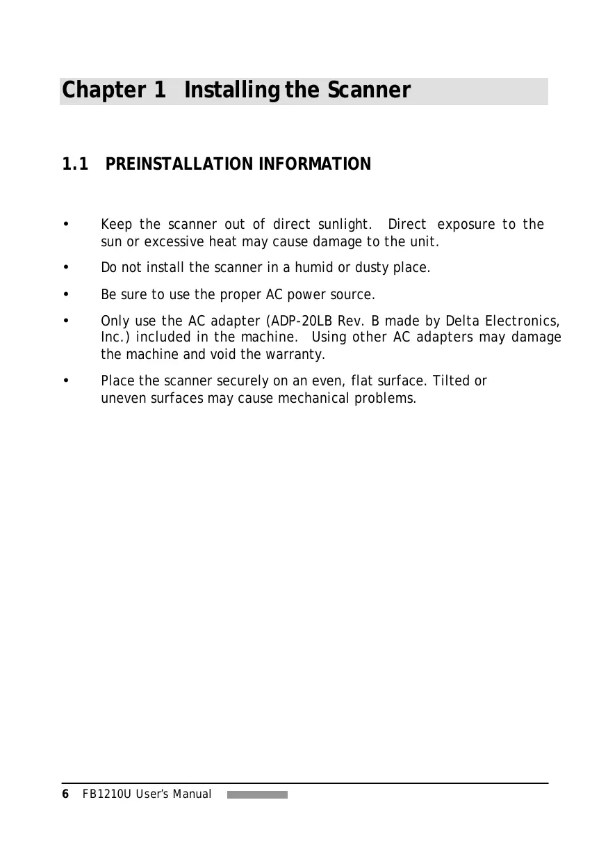 . Keep the scanner out of direct sunlight. Direct exposure to the sun or excessive heat may cause damage to the unit. . Do not install the scanner in a humid or dusty place. . Be sure to use the proper AC power source. . Only use the AC adapter (ADP-20LB Rev. B made by Delta Electronics, Inc.) included in the machine. Using other AC adapters may damage the machine and void the warranty. . Place the scanner securely on an even, flat surface. Tilted or uneven surfaces may cause mechanical problems. 6 FB1210U Users Manual