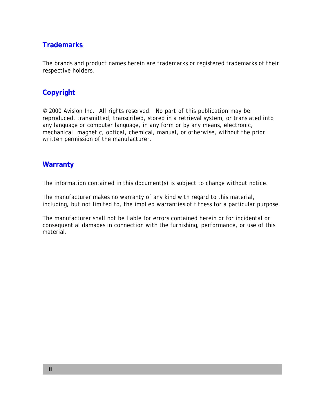Trademarks The brands and product names herein are trademarks or registered trademarks of their respective holders. Copyright © 2000 Avision Inc. All rights reserved. No part of this publication may be reproduced, transmitted, transcribed, stored in a retrieval system, or translated into any language or computer language, in any form or by any means, electronic, mechanical, magnetic, optical, chemical, manual, or otherwise, without the prior written permission of the manufacturer. Warranty The information contained in this document(s) is subject to change without notice. The manufacturer makes no warranty of any kind with regard to this material, including, but not limited to, the implied warranties of fitness for a particular purpose. The manufacturer shall not be liable for errors contained herein or for incidental or consequential damages in connection with the furnishing, performance, or use of this material.