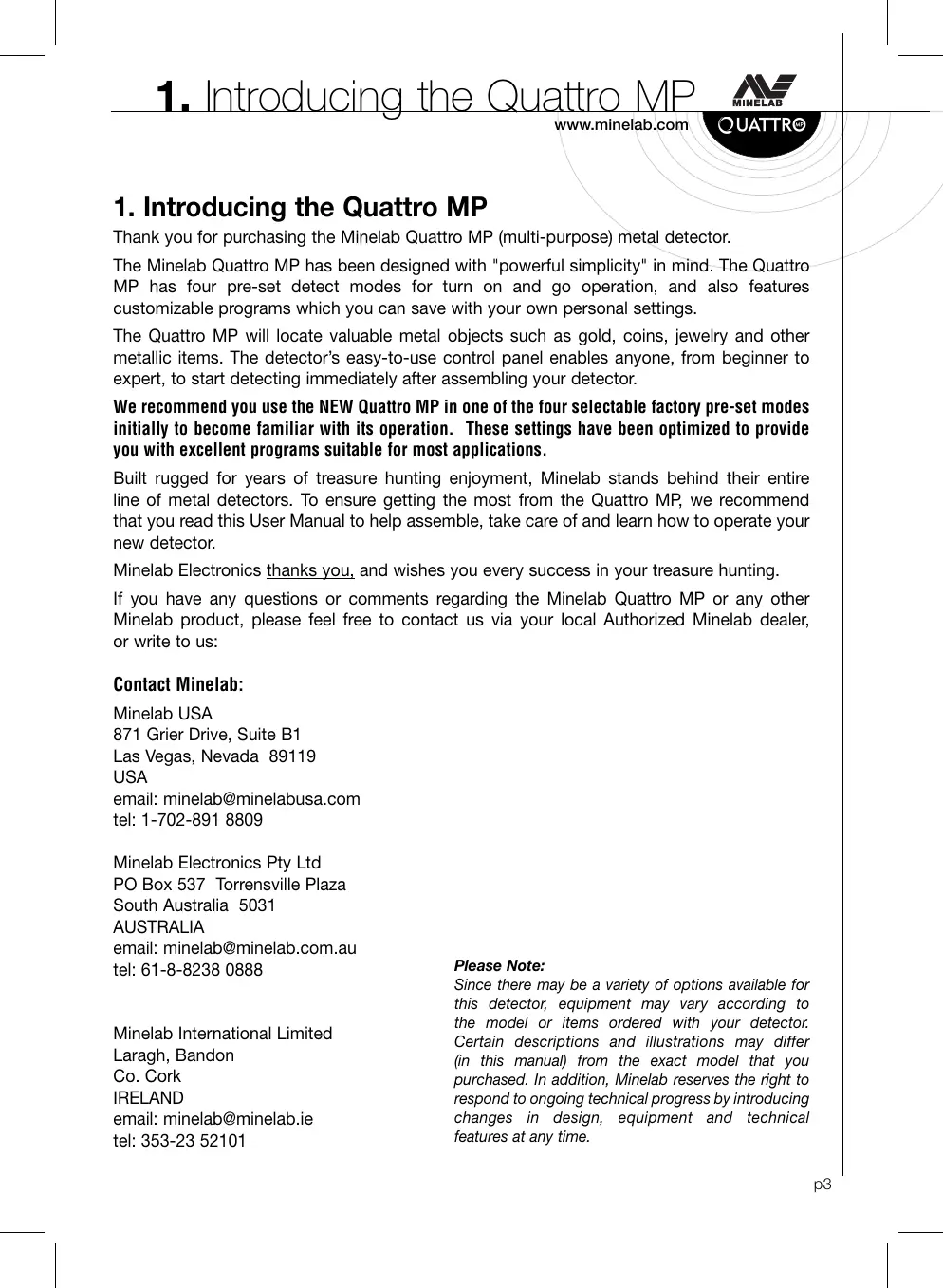 Built rugged for years of treasure hunting enjoyment, Minelab stands behind their entire line of metal detectors. To ensure getting the most from the Quattro MP, we recommend that you read this User Manual to help assemble, take care of and learn how to operate your new detector.