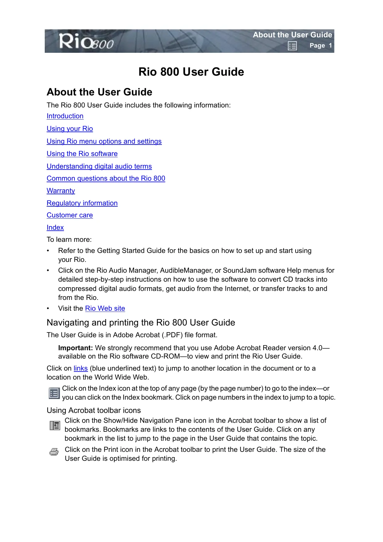Important: We strongly recommend that you use Adobe Acrobat Reader version 4.0—available on the Rio software CD-ROM—to view and print the Rio User Guide.