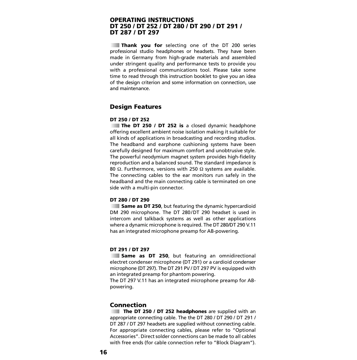 Thank you for selecting one of the DT 200 series professional studio headphones or headsets. They have been made in Germany from high-grade materials and assembled under stringent quality and performance tests to provide you with a professional communications tool. Please take some time to read through this instruction booklet to give you an idea of the design criterion and some information on connection, use and maintenance.