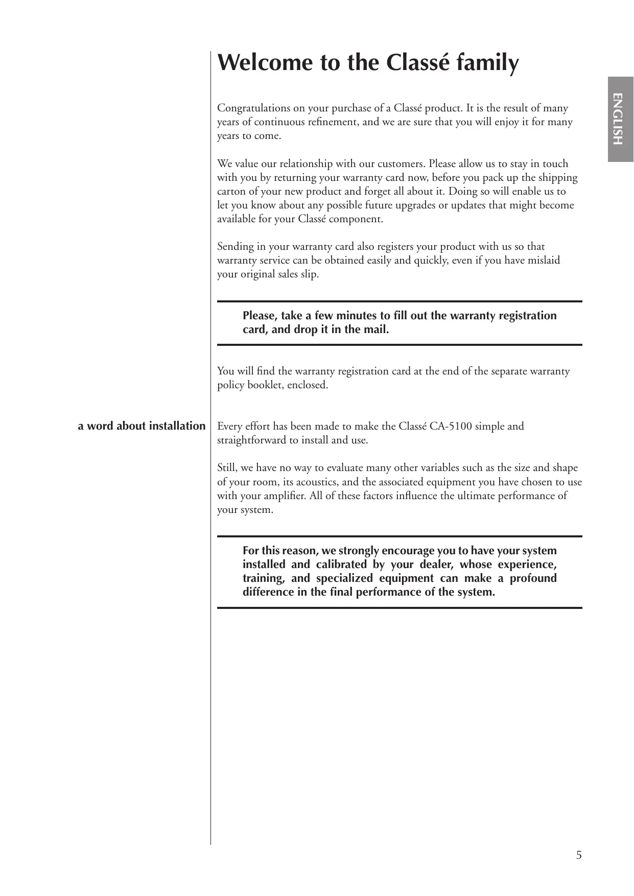 We value our relationship with our customers. Please allow us to stay in touch with you by returning your warranty card now, before you pack up the shipping carton of your new product and forget all about it. Doing so will enable us to let you know about any possible future upgrades or updates that might become available for your Classé component.