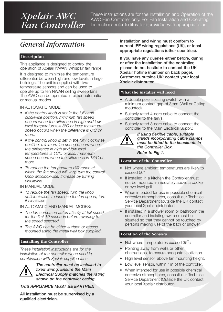 Xpelair AWC Fan Controller mu > instructions are for the Installation and Operatior AWC Fan Controller only. For Fan Installation-andOpet to literature provided with appropriai General Information De: riptio This appliance is designed to control the operation of Xpelair NWAN Whispair fan range. It is designed to minimise the temperature differential between high and low levels in large buïldings. The unit is supplied with two temperature sensors and can be used to operate up to ten NWAN celing sweep fans. The AWC can be operated in either automatic: or manual modes. IN AUTOMATIC MODE: + Ifthe control knob is set in the fully anti- clockwise position, minimum fan speed occurs when the difference in high and low level temperatures is 8°C or less: maximum speed occurs when the difference is 6°C or more. If the control knob is set in the fully clockwise position, minimum fan speed occurs when the difference in high and low level temperatures is 10°C or less: maximum speed occurs when the difference is 18°C or more. To reduce the temperature difference at which the fan speed wil vary, turn the control knob anticlockwise. Increase by tuning clockwise! IN MANUAL MODE: + To reduce the fan speed, turn the knob anticlockwise. To increase the fan speed, tum it clockwise. IN AUTOMATIC AND MANUAL MODES: +_The fan comes on automatically at full speed for the first 10 seconds before reverting to the speed selected. +_ The AWC can be either surface or recess mounted using the metal wall box supplied. These installation instructions are for the installation of the controller when used in combination with Xpelair supplied fans. The controller must be installed to fixed wiring. Ensure the Main Electrical Supply matches the rating shown on the controller casing. THIS APPLIANCE MUST BE EARTHED! All installation must be supervised by a qualified electrician. Installation and wiring must conform to current IEE wiring regulations (UK), or local appropriate regulations (other countries). If you have any queries either before, during or after the installation of the controller, please do not hesitate to contact the UK Xpelair hotline (number on back page). Customers outside UK: contact your local Xpelair distributor.