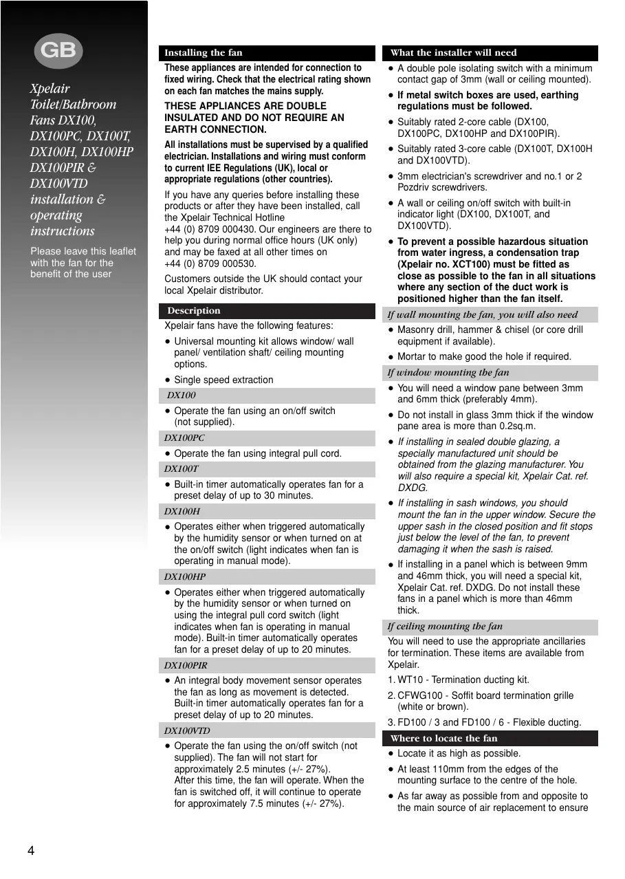 Xpelair Toilet/Bathroom Fans DX100, DX100PC, DX100T, DX100H, DX100HP DX100PIR & DX100VTD installation & operating instructions Please leave this leaflet with the fan for the benefit of the user