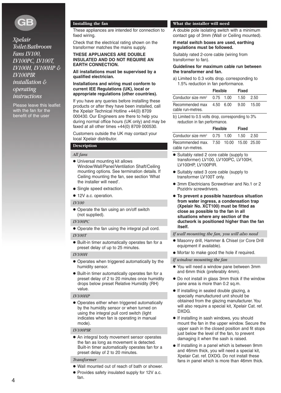 Xpelair Toilet/Bathroom Fans LV100, LV100PC, LV100T, LV100H, LV100HP & LV100PIR installation & operating instructions Please leave this leaflet with the fan for the benefit of the user Installing the fan What the installer will need These appliances are intended for connection to fixed wiring. A double pole isolating switch with a minimum contact gap of 3mm (Wall or Ceiling mounted). Check that the electrical rating shown on the transformer matches the mains supply. If metal switch boxes are used, earthing regulations must be followed.