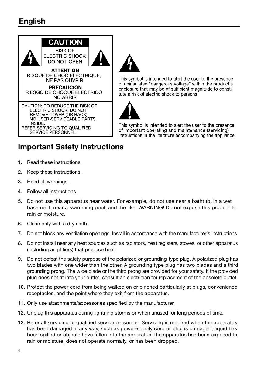 13. Refer all servicing to qualified service personnel. Servicing is required when the apparatus