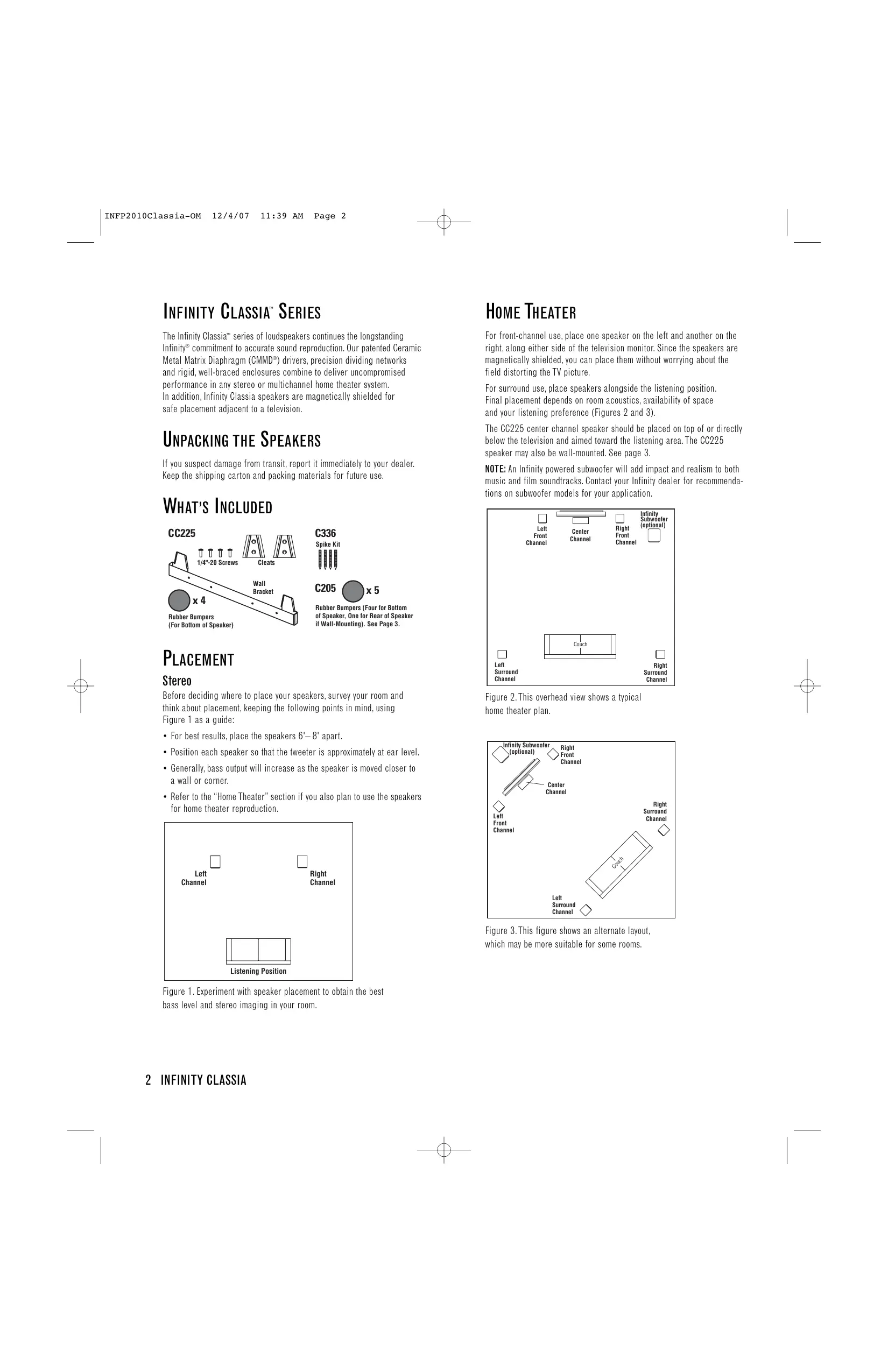 © 2007 Harman International Industries, Incorporated. Al rights reserved Infinity Systems, 250 Crossays Park Drive, Woodbury, NY 11797 USA 516.674.4463 (USA only) wunwinfinitysystems.com Infinity and CMMD (patent nos. 6,327,872 and 6,404,897) are trademarks of Harman International Industries, Incorporated registered in the United States and/or other countries, Infinity Classia is a trademark of Harman International Industries, Incorporated Part No. BO-13333-01 12/07 H A Harman International Company