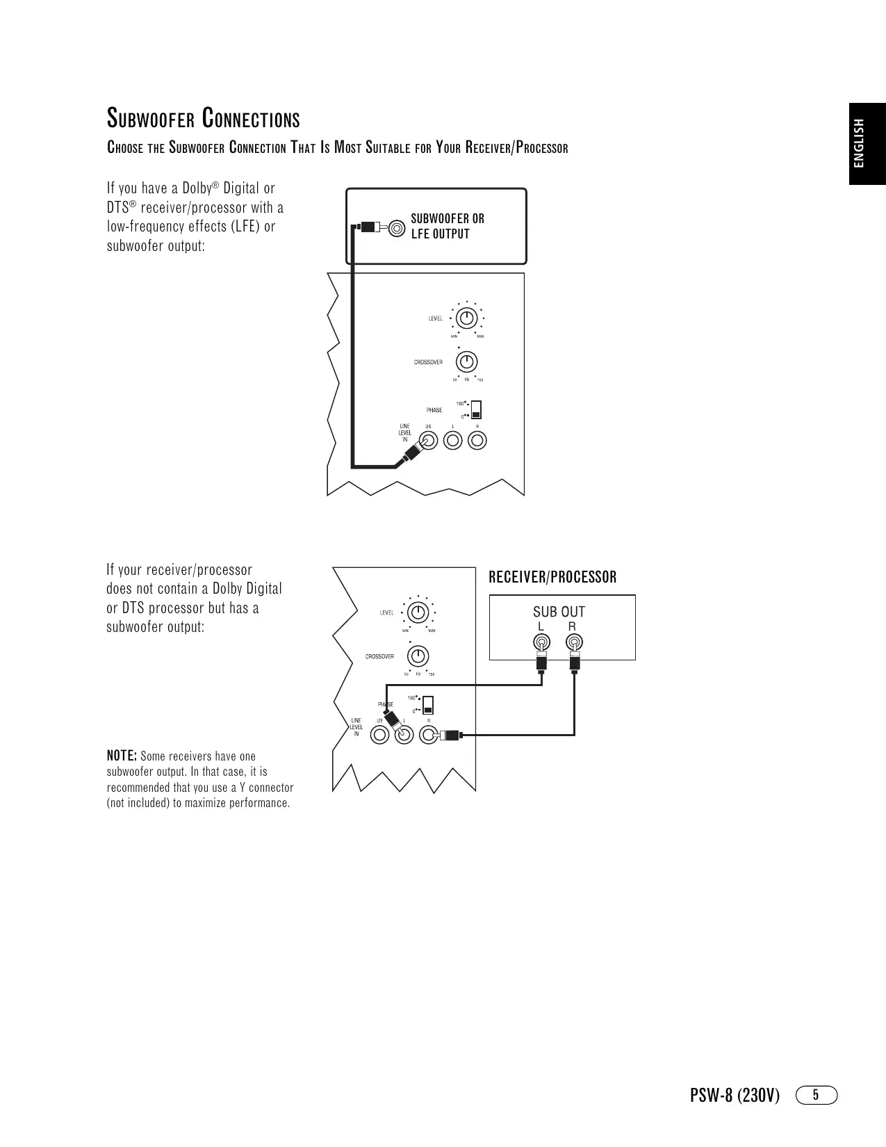 SUBWOOFER CONNECTIONS Cuoose THE Sugwoorer Connection THar 1s Most Suirae For Your RECEIVER/PROCESSOR If you have a Dolby® Digital or DTS® receiver/processor with a low-frequency effects (LFE) or subwoofer output: If your receiver/processor does not contain a Dolby Digital or DTS processor but has a subwoofer output: NOTE: Some receivers have one subwoofer output. In that case, it is recommended that you use a Ÿ connector {not included) to maximize performance SUBWOOFER OR "© L re ouTPuT