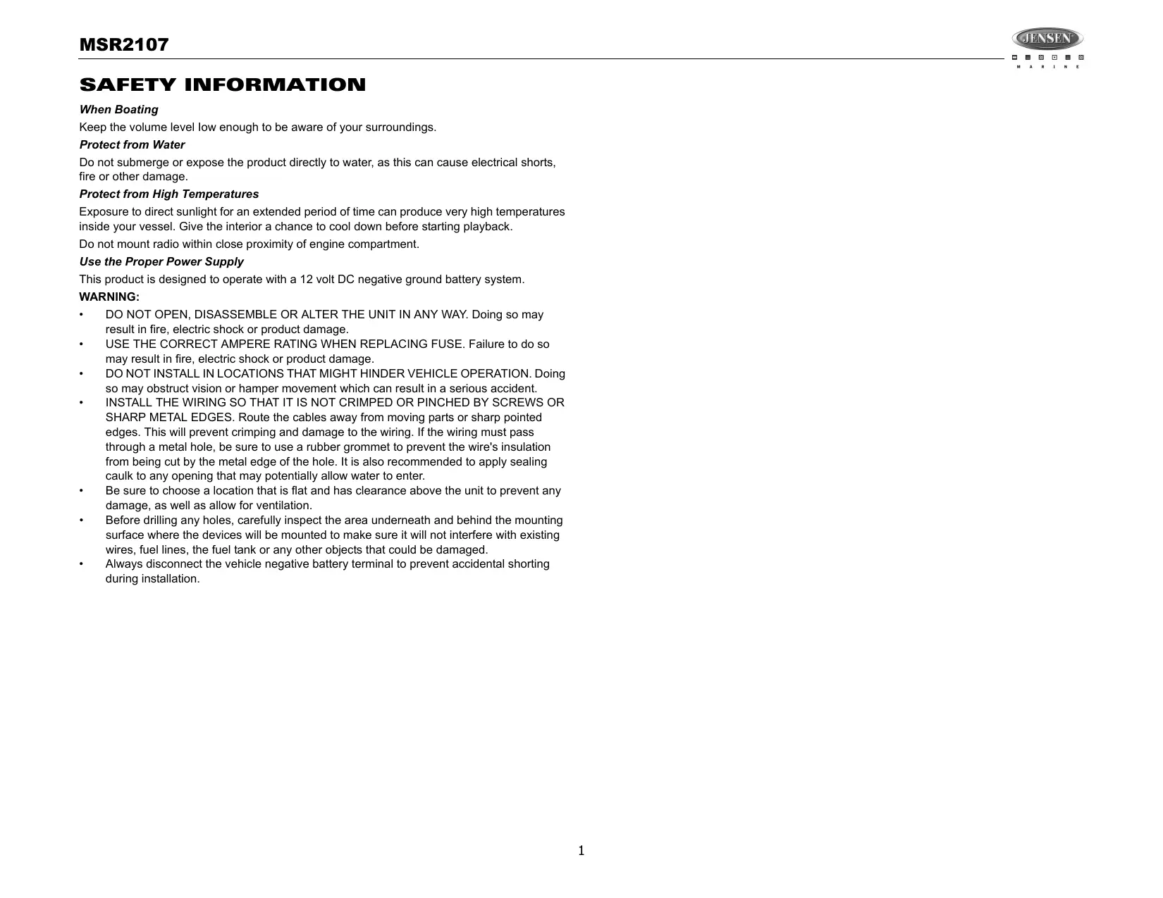 MSR2107 SAFETY INFORMATION When Boating Keep the volume level Iow enough to be aware of your surroundings. Protect from Water Do not submerge or expose the product directly to water, as this can cause electrical shorts, fire or other damage. Protect from High Temperatures Exposure to direct sunlight for an extended period of time can produce very high temperatures inside your vessel. Give the interior a chance to cool down before starting playback. Do not mount radio within close proximity of engine compartment. Use the Proper Power Supply This product is designed to operate with a 12 volt DC negative ground battery system.