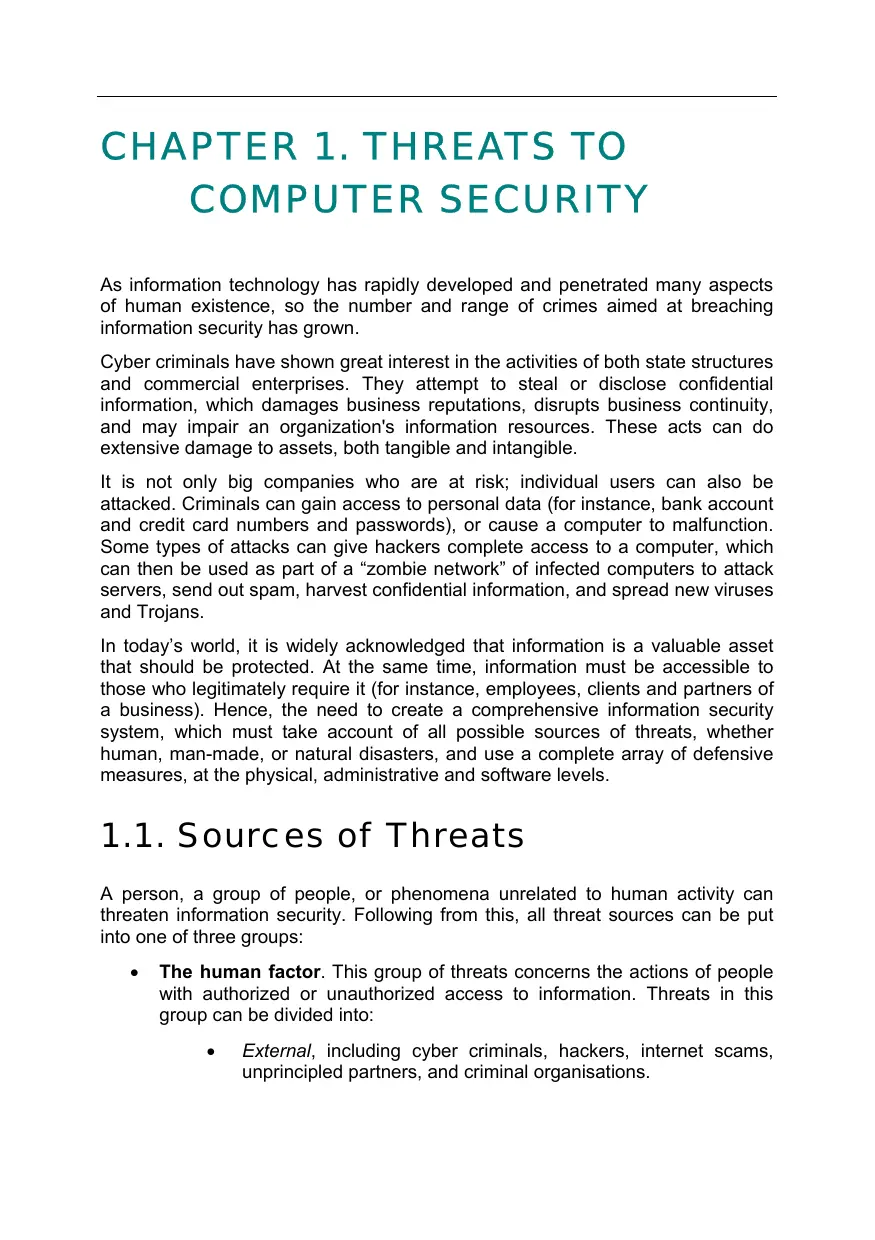 COMPUTER SECURITY As information technology has rapidly developed and penetrated many aspects of human existence, so the number and range of crimes aimed at breaching information security has grown. Cyber criminals have shown great interest in the activities of both state structures and commercial enterprises. They attempt to steal or disclose confidential information, which damages business reputations, disrupts business continuity, and may impair an organization's information resources. These acts can do extensive damage to assets, both tangible and intangible. lt is not only big companies who are at risk; individual users can also be attacked. Criminals can gain access to personal data (for instance, bank account and credit card numbers and passwords), or cause a computer to malfunction. Some types of attacks can give hackers complete access to a computer, which can then be used as part of a “zombie network” of infected computers to attack servers, send out spam, harvest confidential information, and spread new viruses and Trojans. In today's world, it is widely acknowledged that information is a valuable asset that should be protected. At the same time, information must be accessible to those who legitimately require it (for instance, employees, clients and partners of a business). Hence, the need to create a comprehensive information security system, which must take account of all possible sources of threats, whether human, man-made, or natural disasters, and use a complete array of defensive measures, at the physical, administrative and software levels. 1.1. Sources of Threats À person, a group of people, or phenomena unrelated to human activity can threaten information security. Following from this, all threat sources can be put into one of three groups: + _ The human factor. This group of threats concerns the actions of people with authorized or unauthorized access to information. Threats in this group can be divided into: + External, including cyber criminals, hackers, internet scams, unprincipled partners, and criminal organisations.