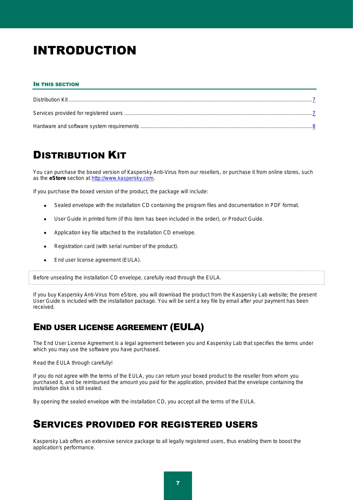 Distribution Kit. Services provided for registered users Hardware and software system requirements … DISTRIBUTION KIT You can purchase the boxed version of Kaspersky Anti-Virus from our resellers, or purchase it from online stores, such as the eStore section at http:/Www.kaspersky.com. If you purchase the boxed version of the product, the package will include: + Sealed envelope with the installation CD containing the program files and documentation in PDF format. + User Guide in printed form (if this item has been included in the order), or Product Guide. + Application key file attached to the installation CD envelope. + Registration card (with serial number of the product). + Enduserlicense agreement (EULA). Before unsealing the installation CD envelope, carefully read through the EULA. If you buy Kaspersky Anti-Virus from eStore, you will download the product from the Kaspersky Lab website; the present User Guide is included with the installation package. You will be sent a key file by email after your payment has been received. END USER LICENSE AGREEMENT (EULA) The End User License Agreementis a legal agreement between you and Kaspersky Lab that specifies the terms under which you may use the software you have purchased. Read the EULA through carefully! If you do not agree with the terms of the EULA, you can return your boxed product to the reseller from whom you purchased it, and be reimbursed the amount you paid for the application, provided that the envelope containing the installation disk is still sealed. By opening the sealed envelope with the installation CD, you accept all the terms ofthe EULA.