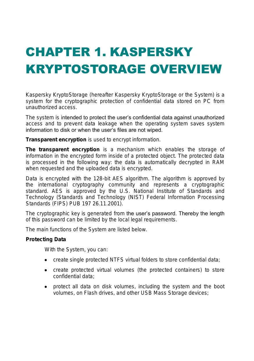 KRYPTOSTORAGE OVERVIEW Kaspersky KryptoStorage (hereafter Kaspersky KryptoStorage or the System) is a system for the cryptographic protection of confidential data stored on PC from unauthorized access. The system is intended to protect the user's confidential data against unauthorized access and to prevent data leakage when the operating system saves system information to disk or when the user's files are not wiped. Transparent encryption is used to encrypt information. The transparent encryption is a mechanism which enables the storage of information in the encrypted form inside of a protected object. The protected data is processed in the following way: the data is automatically decrypted in RAM when requested and the uploaded data is encrypted. Data is encrypted with the 128-bit AES algorithm. The algorithm is approved by the international cryptography community and represents a cryptographic standard. AES is approved by the U.S. National Institute of Standards and Technology (Standards and Technology (NIST) Federal Information Processing Standards (FIPS) PUB 197 26.11.2001). The cryptographic key is generated from the user's password. Thereby the length of this password can be limited by the local legal requirements. The main functions of the System are listed below. Protecting Data With the System, you can: