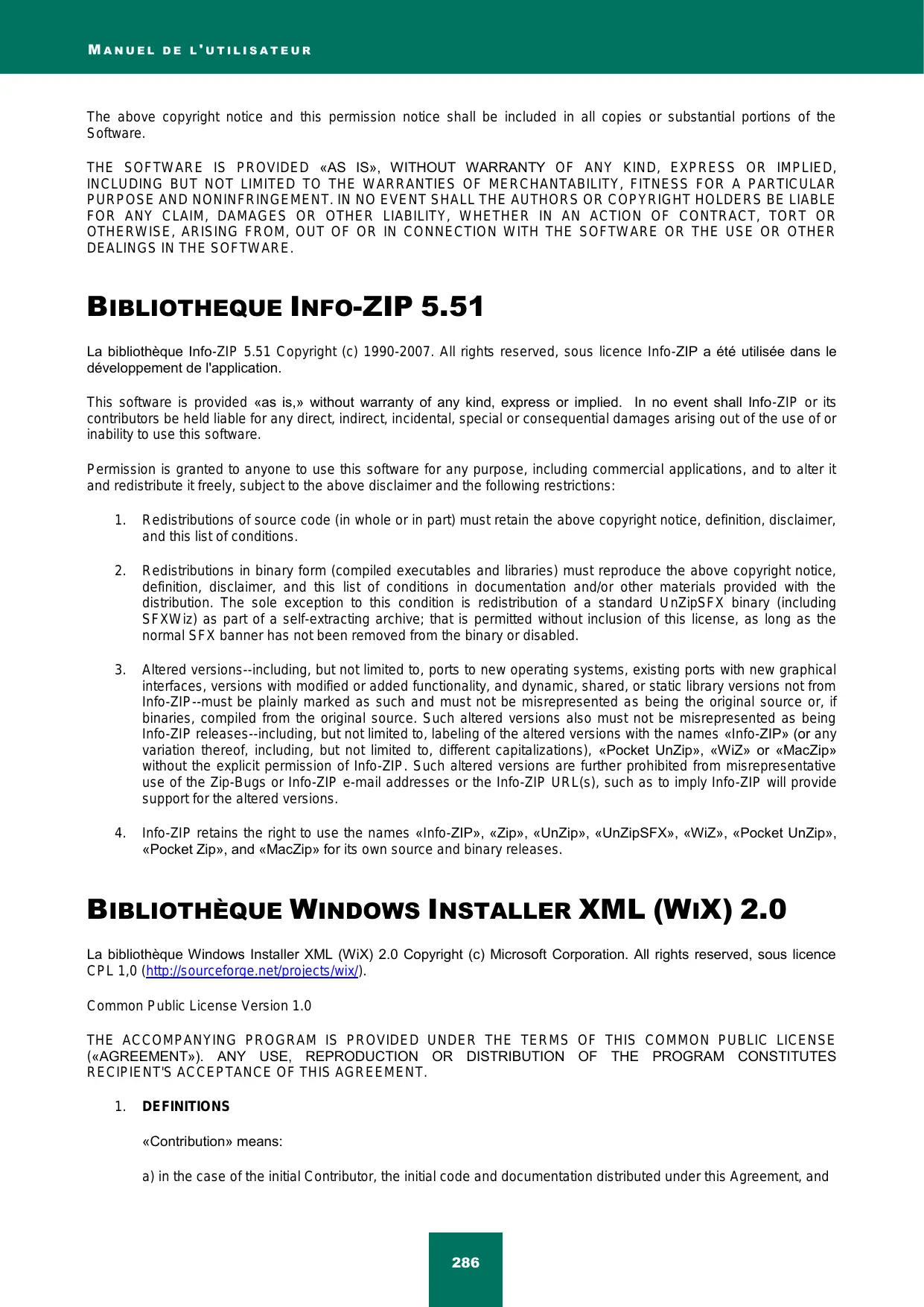 MANUEL DE L'UTILISATEUR The above copyright notice and this permission notice shall be included in all copies or substantial portions of the Software. THE SOFTWARE IS PROVIDED «AS IS», WITHOUT WARRANTY OF ANY KIND, EXPRESS OR IMPLIED, INCLUDING BUT NOT LIMITED TO THE WARRANTIES OF MERCHANTABILITY, FITNESS FOR A PARTICULAR PURPOSE AND NONINFRINGEMENT. IN NO EVENT SHALL THE AUTHORS OR COPYRIGHT HOLDERS BE LIABLE FOR ANY CLAIM, DAMAGES OR OTHER LIABILITY, WHETHER IN AN ACTION OF CONTRACT, TORT OR OTHERWISE, ARISING FROM, OUT OF OR IN CONNECTION WITH THE SOFTWARE OR THE USE OR OTHER DEALINGS IN THE SOFTWARE. BIBLIOTHEQUE INFO-ZIP 5.51 La bibliothèque Info-ZIP 5.51 Copyright (c) 1990-2007. All rights reserved, sous licence Info-ZIP a été utilisée dans le développement de l'application. This software is provided «as is,» without warranty of any kind, express or implied. In no event shall Info-ZIP or its contributors be held liable for any direct, indirect, incidental, special or consequential damages arising out of the use of or inability to use this software. Permission is granted to anyone to use this software for any purpose, including commercial applications, and to alter it and redistribute it freely, subject to the above disclaimer and the following restrictions:
