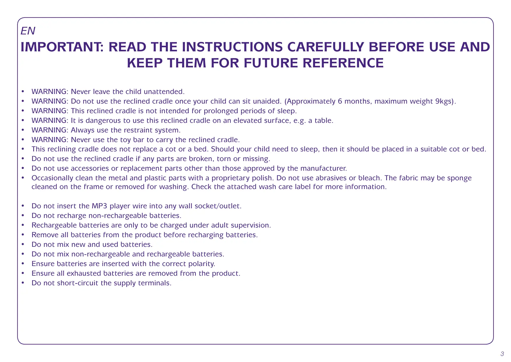 This reclining cradle does not replace a cot or a bed. Should your child need to sleep, then it should be placed in a suitable cot or bed. Do not use the reclined cradle if any parts are broken, torn or missing. Do not use accessories or replacement parts other than those approved by the manufacturer. Occasionally clean the metal and plastic parts with a proprietary polish. Do not use abrasives or bleach. The fabric may be sponge cleaned on the frame or removed for washing. Check the attached wash care label for more information. Do not insert the MP3 player wire into any wall socket/outlet. Do not recharge non-rechargeable batteries. Rechargeable batteries are only to be charged under adult supervision. Remove all batteries from the product before recharging batteries. Do not mix new and used batteries. Do not mix non-rechargeable and rechargeable batteries. Ensure batteries are inserted with the correct polarity. Ensure all exhausted batteries are removed from the product. Do not short-circuit the supply terminals. CA (cont...) IMPORTANT! NOTICE À CONSERVER POUR VOUS Y REPORTER ULTÉRIEUREMENT