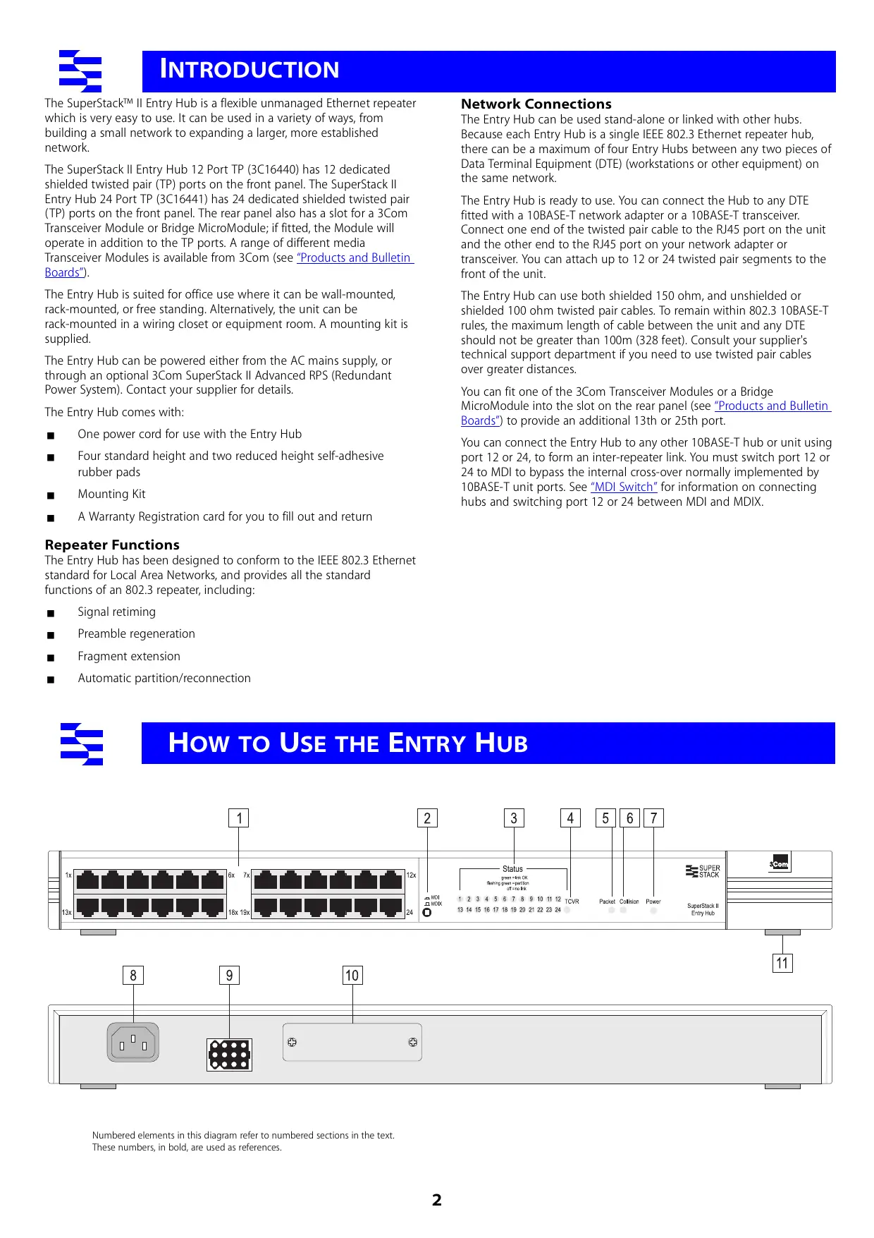Repeater Functions The Entry Hub has been designed to conform to the IEEE 802.3 Ethernet standard for Local Area Networks, and provides all the standard functions of an 802.3 repeater, including: ■