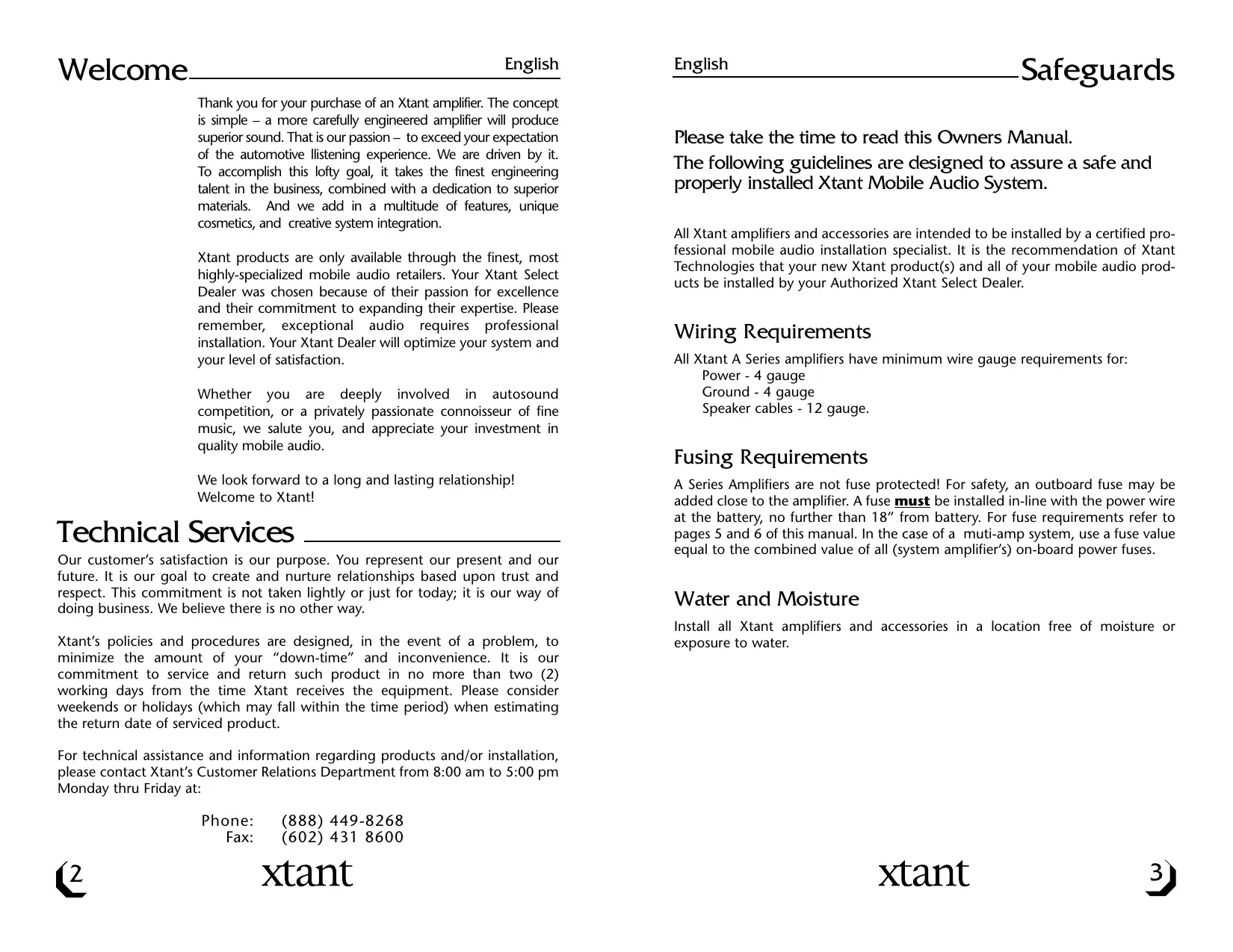 Please take the time to read this Owners Manual. The following guidelines are designed to assure a safe and properly installed Xtant Mobile Audio System. All Xtant amplifiers and accessories are intended to be installed by a certified professional mobile audio installation specialist. It is the recommendation of Xtant Technologies that your new Xtant product(s) and all of your mobile audio products be installed by your Authorized Xtant Select Dealer.