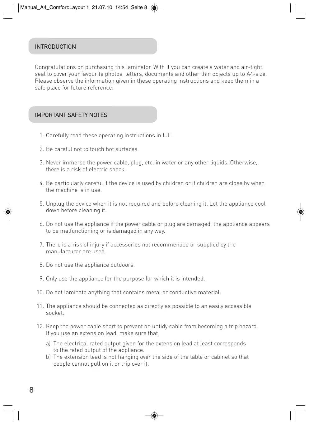 Congratulations on purchasing this laminator. With it you can create a water and air-tight seal to cover your favourite photos, letters, documents and other thin objects up to A4-size. Please observe the information given in these operating instructions and keep them in a safe place for future reference.