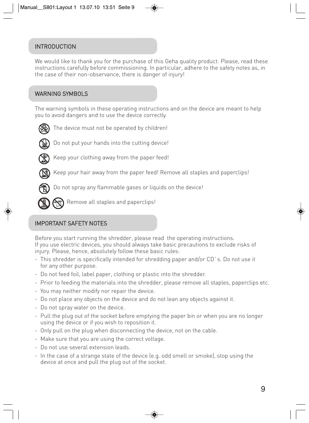 SHREDDER Office X8 CD INTRODUCTION We would like to thank you for the purchase of this Geha quality product. Please, read these instructions carefully before commissioning. In particular, adhere to the safety notes as, in the case of their non-observance, there is danger of injury! WARNING SYMBOLS The warning symbols in these operating instructions and on the device are meant to help you to avoid dangers and to use the device correctly. The device must not be operated by children! Do not put your hands into the cutting device! Keep your clothing away from the paper feed! Keep your hair away from the paper feed! Remove all staples and paperclips! Do not spray any flammable gases or liquids on the device! Remove all staples and paperclips!