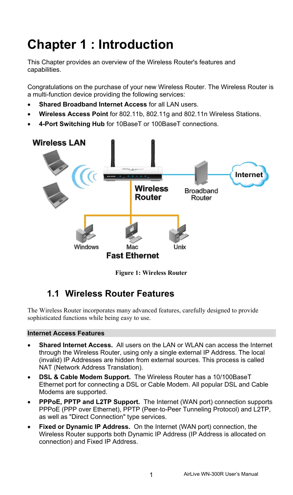 The Wireless Router incorporates many advanced features, carefully designed to provide sophisticated functions while being easy to use. Internet Access Features Shared Internet Access. All users on the LAN or WLAN can access the Internet through the Wireless Router, using only a single external IP Address. The local (invalid) IP Addresses are hidden from external sources. This process is called NAT (Network Address Translation). DSL & Cable Modem Support. The Wireless Router has a 10/100BaseT Ethernet port for connecting a DSL or Cable Modem. All popular DSL and Cable Modems are supported. PPPO0E, PPTP and L2TP Support. The Internet (WAN port) connection supports PPP0E (PPP over Ethernet), PPTP (Peer-to-Peer Tunneling Protocol) and L2TP, as well as "Direct Connection" type services. Fixed or Dynamic IP Address. On the Internet (WAN port) connection, the Wireless Router supports both Dynamic IP Address (IP Address is allocated on connection) and Fixed IP Address. 1 AirLive WN-300R User's Manual