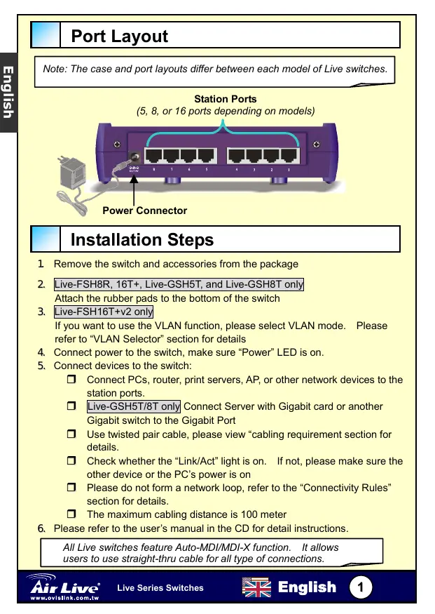All Live switches feature Auto-MDI/MDI-X function. It allows users to use straight-thru cable for all type of connections. Live Series Switches English
