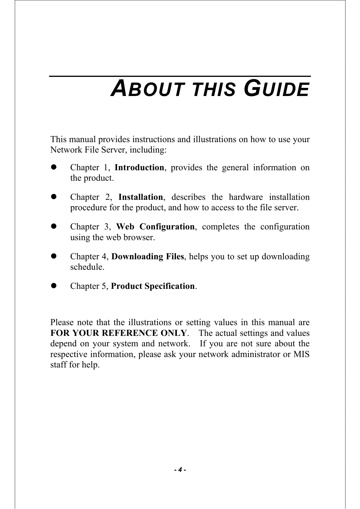 This manual provides instructions and illustrations on how to use your Network File Server, including: © Chapter 1, Introduction, provides the general information on the product. © Chapter 2, Installation, describes the hardware installation procedure for the product, and how to access to the file server. © Chapter 3, Web Configuration, completes the configuration using the web browser. © Chapter 4, Downloading Files, helps you to set up downloading schedule. © Chapter 5, Product Specification. Please note that the illustrations or setting values in this manual are FOR YOUR REFERENCE ONLY. The actual settings and values depend on your system and network. If you are not sure about the respective information, please ask your network administrator or MIS staff for help.