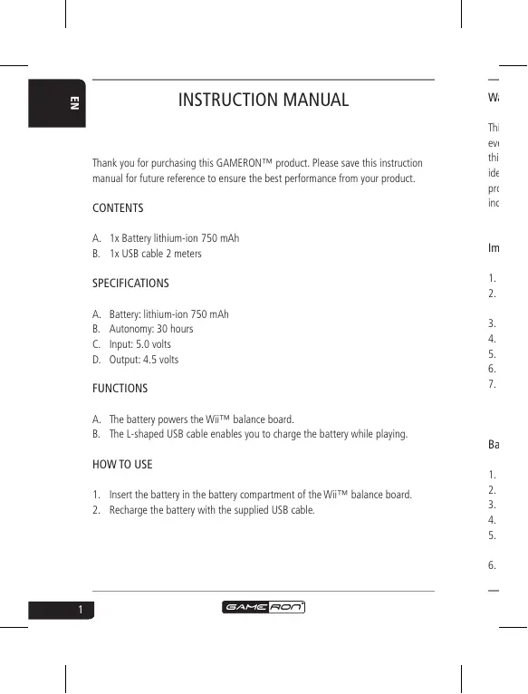 INSTRUCTION MANUAL CONTENTS This produ event of p this period identical o proof of p incorrect u A. 1x Battery lithium-ion 750 mAh B. 1x USB cable 2 meters Importan Thank you for purchasing this GAMERON™ product. Please save this instruction manual for future reference to ensure the best performance from your product. SPECIFICATIONS